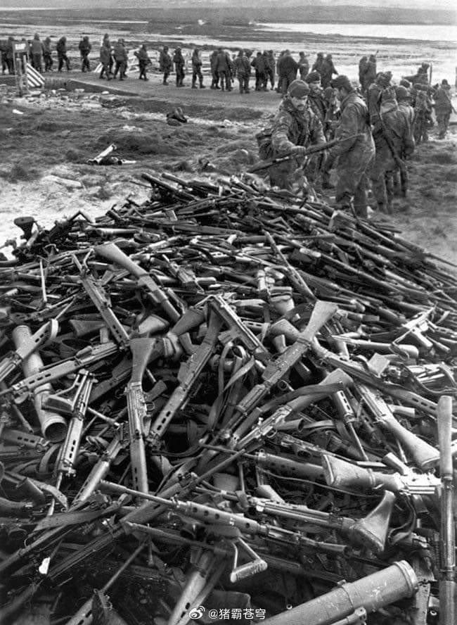 1982 年福克兰群岛战争结束时,英国军队收缴阿根廷士兵的武器。也算经典名场面了