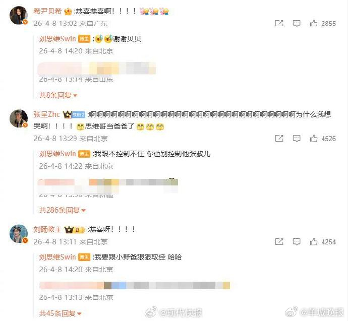 【#喜人在刘思维评论区团建# 】#刘思维当爸爸了# 4月8日, 发文官宣当爸,、、、、、、尹贝希、 等一众喜人演员送上祝福。网友评论:喜人是在思维哥这里团建吗? (现代快报)更多消息:#金子涵 再逼我就把所有的都说出来##江语晨小考突然离场##徐艺洋回应黄子韬身体状况##浪姐小考 完全小品##冰湖重生开局0广#(编辑:杨雨桐;审签:周乐瑞)