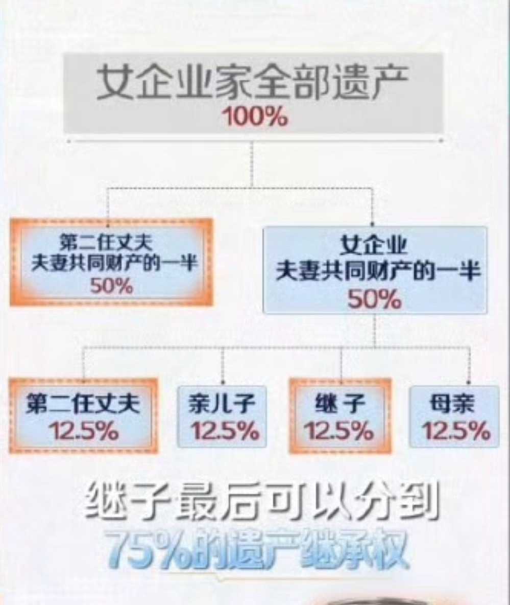 女方猝死遗产继承权亲儿子仅占八分之一这有什么好争议的?就应该这样分好吧!她是和第二任丈夫的共同财产。所以,她的遗产只有50%。这50%再均分给丈夫、母亲、继子、儿子,正好每人12.5%。