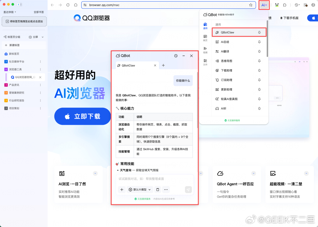 腾讯发布国内首个浏览器龙虾腾讯云官微宣布国内首个浏览器“龙虾”QBotClaw正式上线,打开QQ浏览器电脑端,点击“AI”按钮即可使用。据介绍,它不仅完全兼容OpenClaw技能,还支持用户自由配置国内各大主流大模型的API Key。