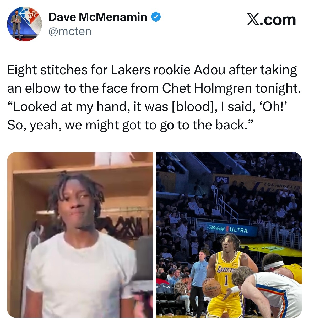 蒂耶罗被切特肘部击中面部,缝了8针:“我看了一眼手,全是血,我当时就说:‘哇哦!’所以,我们确实得去后场处理一下。”