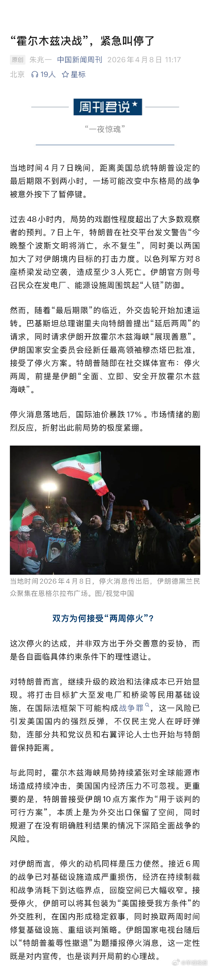 【#美伊双方为何接受两周停火#】#美伊真正的谈判还没有开始# 当地时间4月7日晚间,距离美国总统特朗普设定的最后期限不到两小时,一场可能改变中东格局的战争被意外按下了暂停键。过去48小时内,局势的戏剧性程度超出了大多数观察者的预判。7日上午,特朗普在社交平台发文警告“今晚整个波斯文明将消亡,永不复生”,同时美以两国加大了对伊朗境内目标的打击力度。以色列军方对8座桥梁发动空袭,造成至少3人死亡。伊朗官方则号召民众在发电厂、能源设施周围筑起“人链”防御。