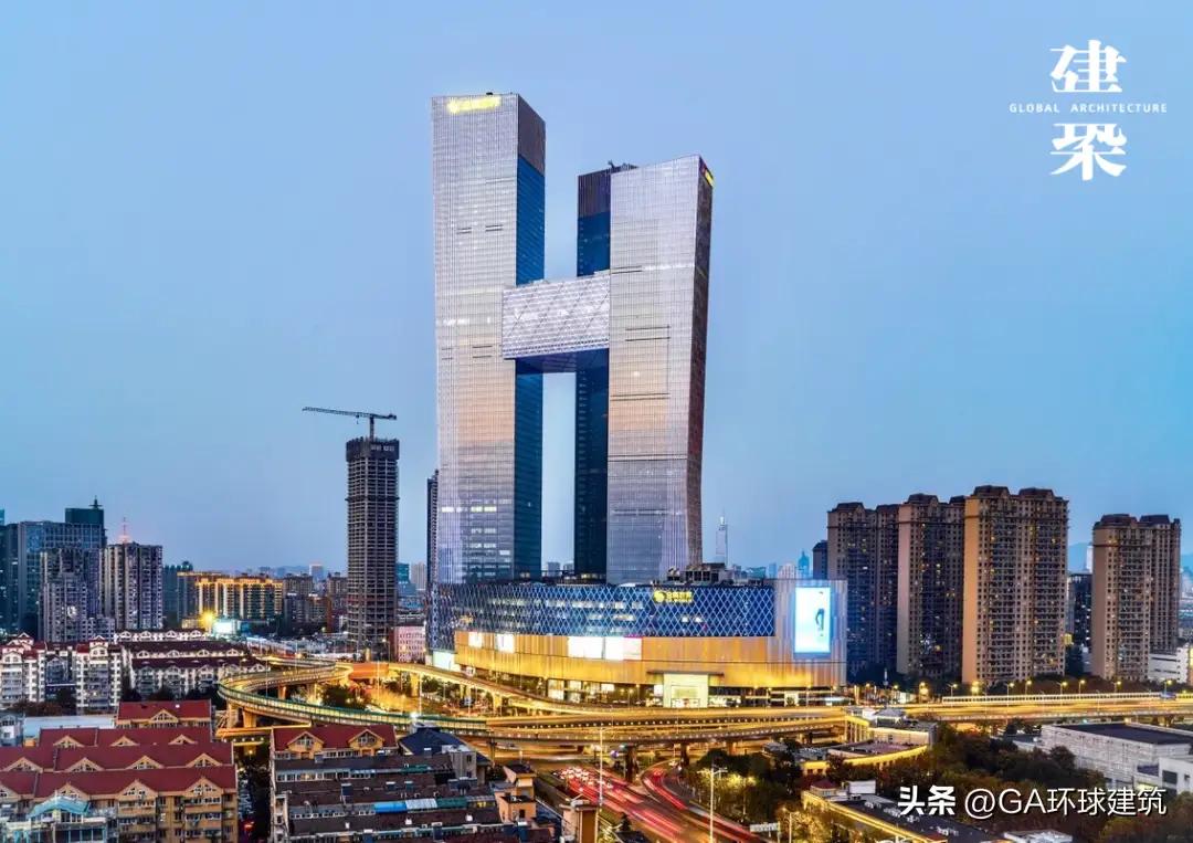 南京金鹰世界超级综合体 总建筑面积达91万平米,含超五星级酒店,5A甲级写字楼,高级公寓,购物中心,空中会客厅于一体的全球三幢三百米以上连体大楼,是南京河西CBd的重要组成部分。190米上2800吨钢架驾于半空,也是全球首屈一指,总投资近百亿!远外看真的像一座巨无霸建筑。