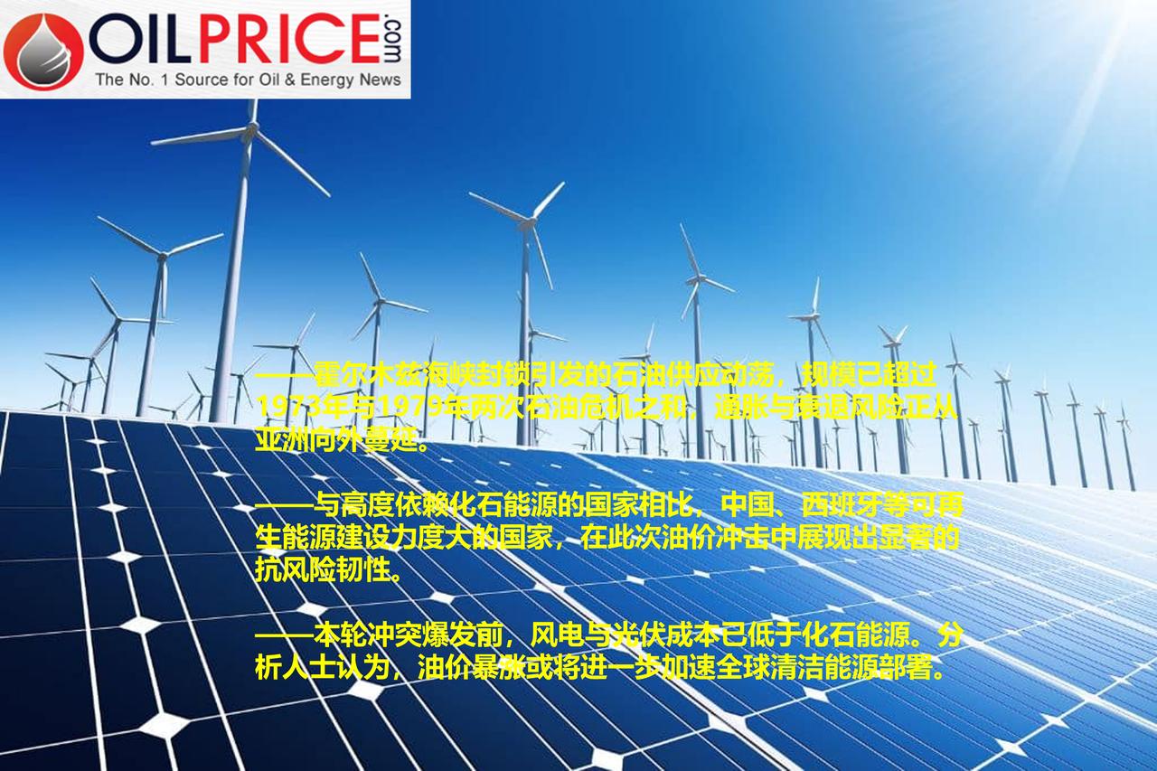 史上最严重石油供应中断促进了全球能源转型的进程吗? 霍尔木兹海峡已停运一个多月。这条航道日均承担全球至少五分之一的油气运输,其实际封锁导致全球能源市场陷入剧烈动荡。此次供应中断的影响规模已超过1973年和1979年两次石油危机的总和,而冲击才刚刚开始。关键问题在于,世界将如何应对这一后果——是退回陈旧的化石能源供应链,还是打造更清洁、更具韧性的可再生能源未来? 尽管当前石油供应中断为史上之最,但其造成的短缺冲击远不及上世纪70年代的危机那般毁灭性。原因在于,如今全球能源结构远比当年多元,这很大程度上得益于可再生能源的普及,让许多国家实现了更高程度的能源自主,降低了对全球化石能源供应链的依赖。 因此,可再生能源产业体系最完善的国家,也是受本轮油价波动影响最小的群体。亚洲能源市场在伊朗冲突中遭受重创,而中国庞大的清洁能源建设规模与巨额原油储备,形成了战略缓冲。在欧洲,西班牙凭借大规模光伏产业,能源价格远较多数邻国稳定。 能源危机接连爆发,世界显然需要优化能源安全战略。事实也已证明,通过清洁能源转型实现能源供应多元化与能源自主,是行之有效的能源安全方案。太阳能、风能与核能几乎可在任何国家生产,而油气供应链天然集中于少数主要产地,注定其供应链始终存在地缘政治风险。 《福布斯》本月初的报道指出,伊朗冲突“再次暴露全球化石能源体系的脆弱性:过多经济话语权集中在极少数地区,且所有资源都必须经过同一片军事化海上咽喉运输”。 “多年来,清洁能源一直被视作道义责任。如今,它已然成为经济与地缘政治层面的必然选择。”报道继续写道,“核心不再是减排,而是韧性与价格稳定。” 截至目前,霍尔木兹海峡封锁与冲突带来的经济影响主要集中在亚洲,但没有任何国家能完全规避此类地缘政治后果。全球其他地区很快也将面临经济困境与高油价,通胀与衰退近在眼前,市场焦虑情绪高涨。 高油价将重创能源进口国,尤其是全球南方的贫困国家。但本轮能源危机也可能推动全球清洁能源转型全面提速。随着油气价格飙升,可再生能源装机量或将迎来爆发式增长——早在美以对伊朗发动空袭前,风电与光伏成本就已低于化石能源。这场虽由危机催生的转型,将为全球经济、能源安全、抗风险能力与气候治理带来深远益处。 “风电和光伏不会被外国势力禁运、封锁或切断。”瑞典斯德哥尔摩风投基金诺尔斯肯合伙人戴维·弗里克曼近日在《财富》专栏中写道,“国内每发一太瓦时可再生电力,就意味着对手少了一个可利用的能源武器。”