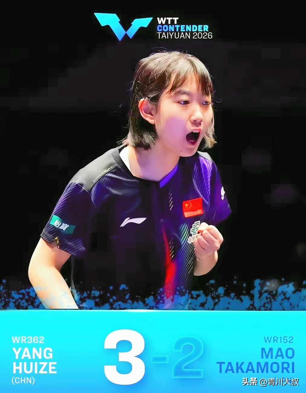 天呐!国乒16岁小将杨惠泽这么猛! 杨惠泽今年才16岁, 这次跨级打成年赛, 教练本来让她来太原挑战赛长长见识, 结果在资格赛, 就让教练长了见识, 3:2把日本天才少女高森爱央淘汰了。 高森爱央是日本重点培养的未来之星, U19排名第二, 第一是张本美和, 这下好了, 连资格赛都打不出来了[捂脸]