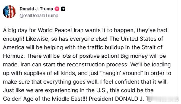 他指出:“美国将协助疏导霍尔木兹海峡的交通。届时将有许多积极的措施!巨额资金将流入伊朗。伊朗可以开始重建进程。我们将运送各种物资,并在现场‘闲荡’,以确保一切顺利进行。我对此充满信心。”他期待着伊朗和中东的巨变,他说:“正如我们在美国所经历的那样,这可能是中东的黄金时代! ! !”