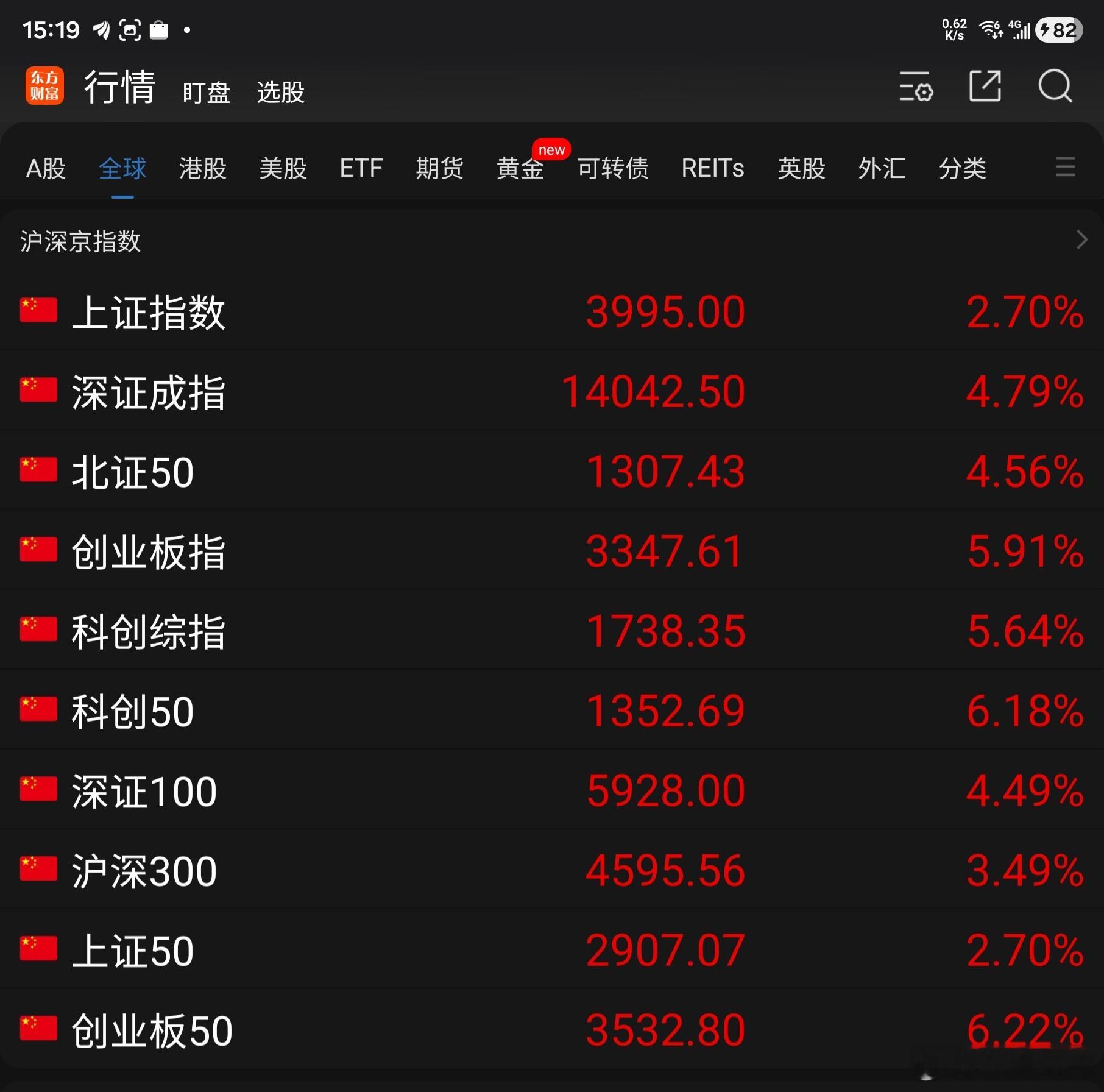 在美国和伊朗宣布停火2 周,进入谈判消息的影响下,今天A 股走出了气势如虹的行情。A 股大盘爆涨:东方财富App 显示的 10 项指数全体大涨收红,涨幅在 2.70%至 6.22 % 之间,上证指数涨 104.84 点至 3995.00 点,离 4000 点大关仅差 5 个点。 个股走势创出奇迹:沪深京三交易所中,上涨的股票有 5024 支,比昨天多 1139 支, 其中涨幅在 7% 以上的高达 660 支,比昨天多 487 支; 持平的股票有 13 支,比昨天少 59 支;下跌的股票 仅 274 支,比昨天少 1082 支, 其中跌幅在7%以上的有 24 支,比昨天多5 支。三个市场全天的成交量为 24510 亿元,比昨天大幅增量 18273 亿元,是昨天量能的2 倍还要多,再次收复了 2 万亿元关口。今天A 股量价大增,应为中东战争暂时停火所致,对提振股民信心,吸引更多存量资金入市带来动力,慢牛行情归来可期
