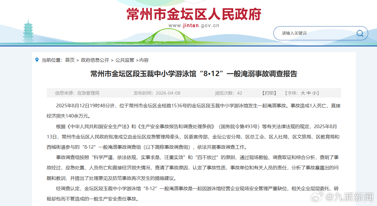 #官方通报游泳馆8岁小学生溺亡#【#游泳馆8岁小学生溺亡调查报告#】4月8日,常州市金坛区政府官网发布常州市金坛区段玉裁中小学游泳馆“8·12”一般淹溺事故调查报告,2025年8月12日19时48分许,位于常州市金坛区金桂路1536号的金坛区段玉裁中小学游泳馆发生一起淹溺事故。事故造成1人死亡,直接经济损失140余万元。经调查认定,金坛区段玉裁中小学游泳馆“8·12”一般淹溺事故是一起因游泳馆经营企业现场安全管理严重缺位,相关企业层层委托、转租却包而不管造成的一般生产安全责任事故。
