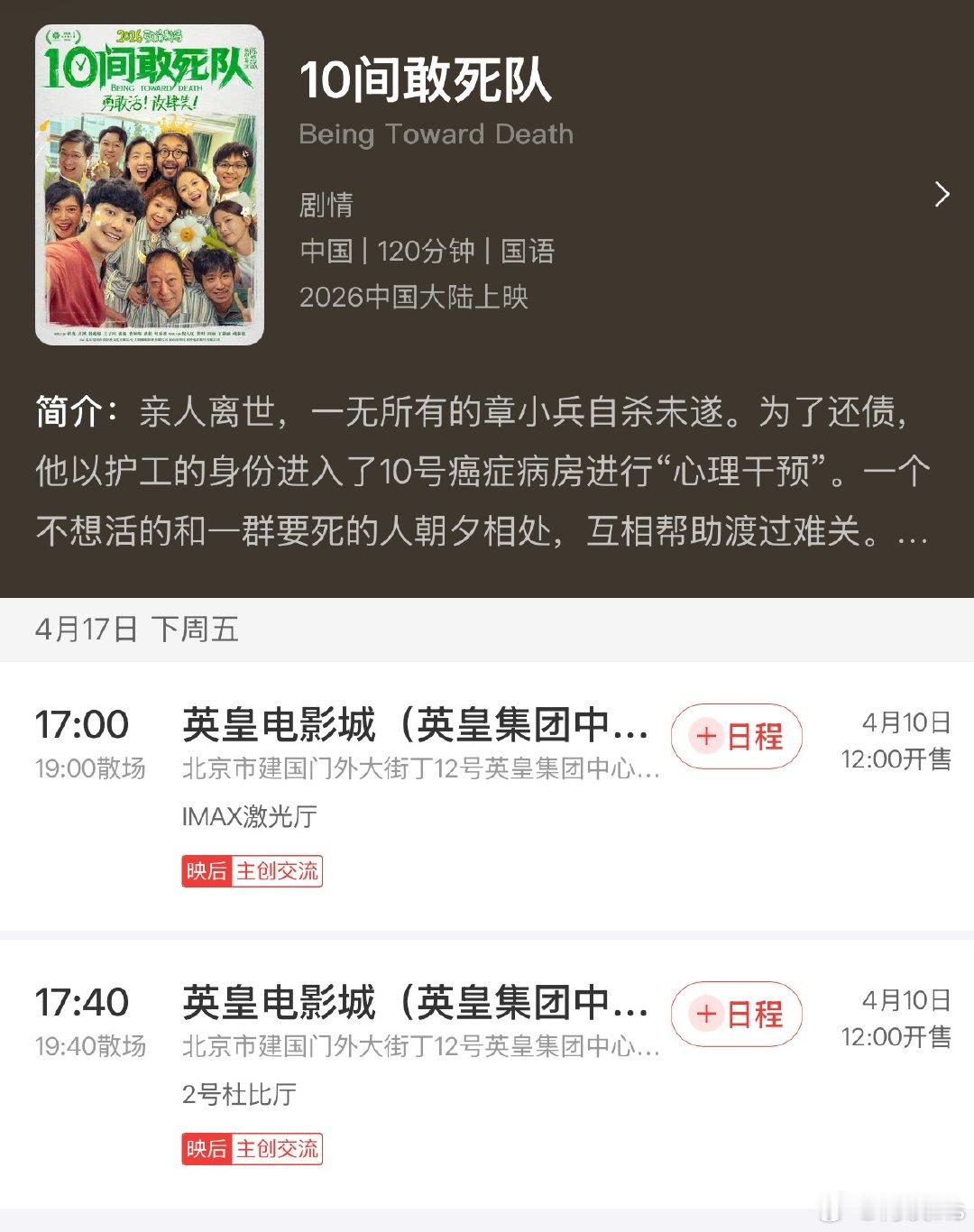 电影《10间敢死队》4.17下午5点,5:40放映两场,片长120分钟陈思诚导演,蒋龙饰演章小兵、杨超越饰演护士谢谢、齐溪饰甄艾、张弛饰林强生