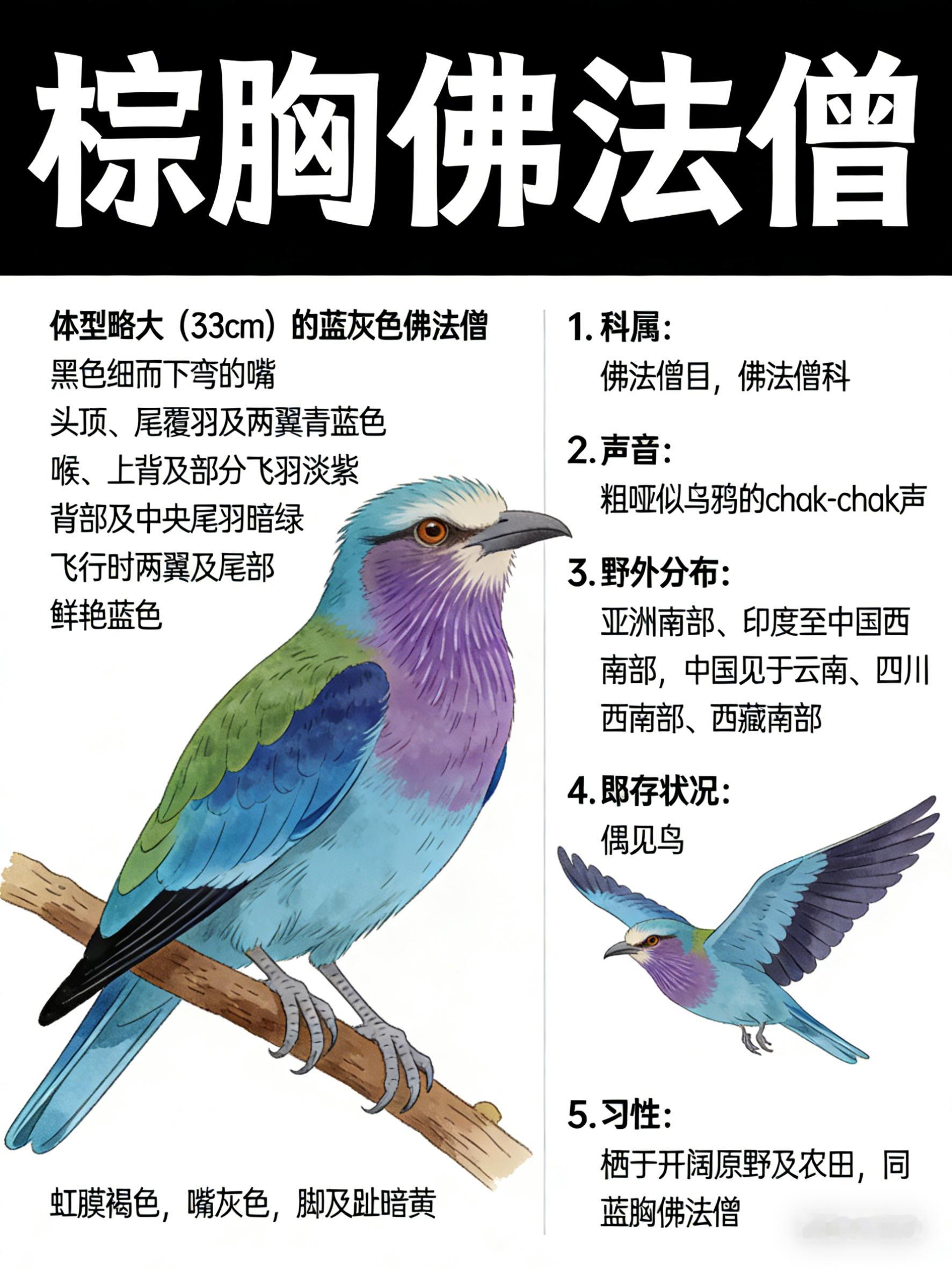 ·习性:栖于开阔原野及农田,同蓝胸佛法僧。