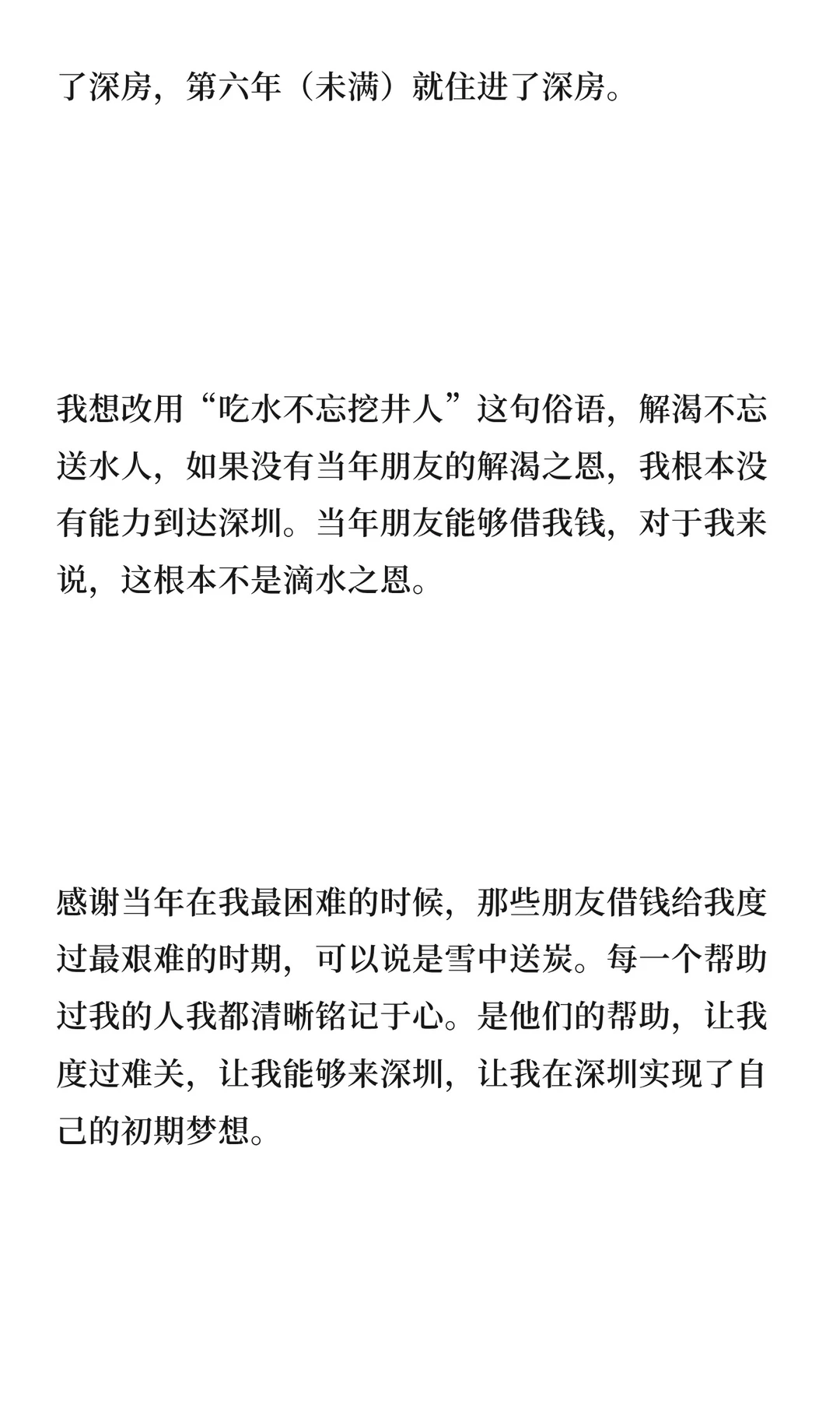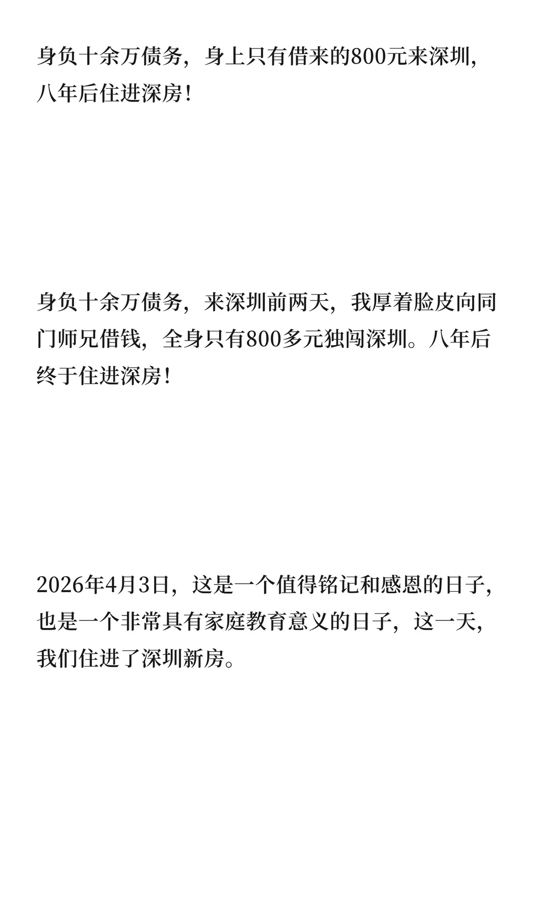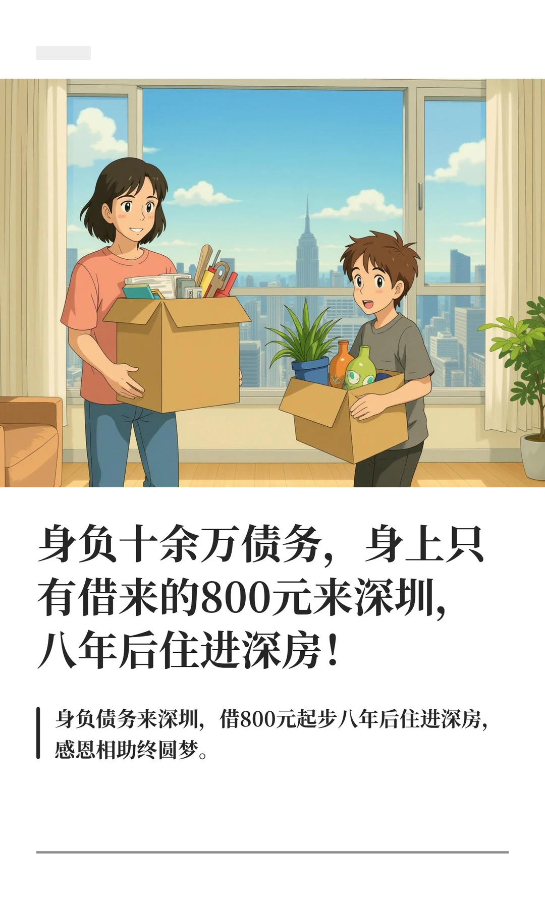 身负债务,深圳独闯八年,八年后住进新房。2018年向师兄借钱800元起步,通过努力实现梦想,感恩朋友和家人支持。