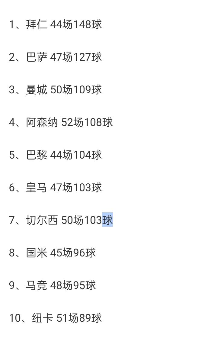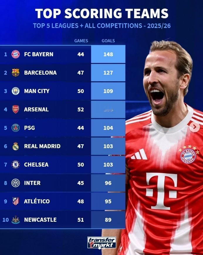 本赛季五大联赛球队总进球榜:拜仁148球断层领跑,巴萨127球次席,曼城 109球第3 4月8日 欧冠淘汰赛首回合,拜仁2-1击败皇马。 德转盘点了本赛季五大联赛球队在各项赛事总进球榜,其中拜仁遥遥领先,具体如下:拜仁 44场148球领跑,巴萨 47场127球第2,曼城 50场109球第3,阿森纳 52场108球第4,巴黎 44场104球第5