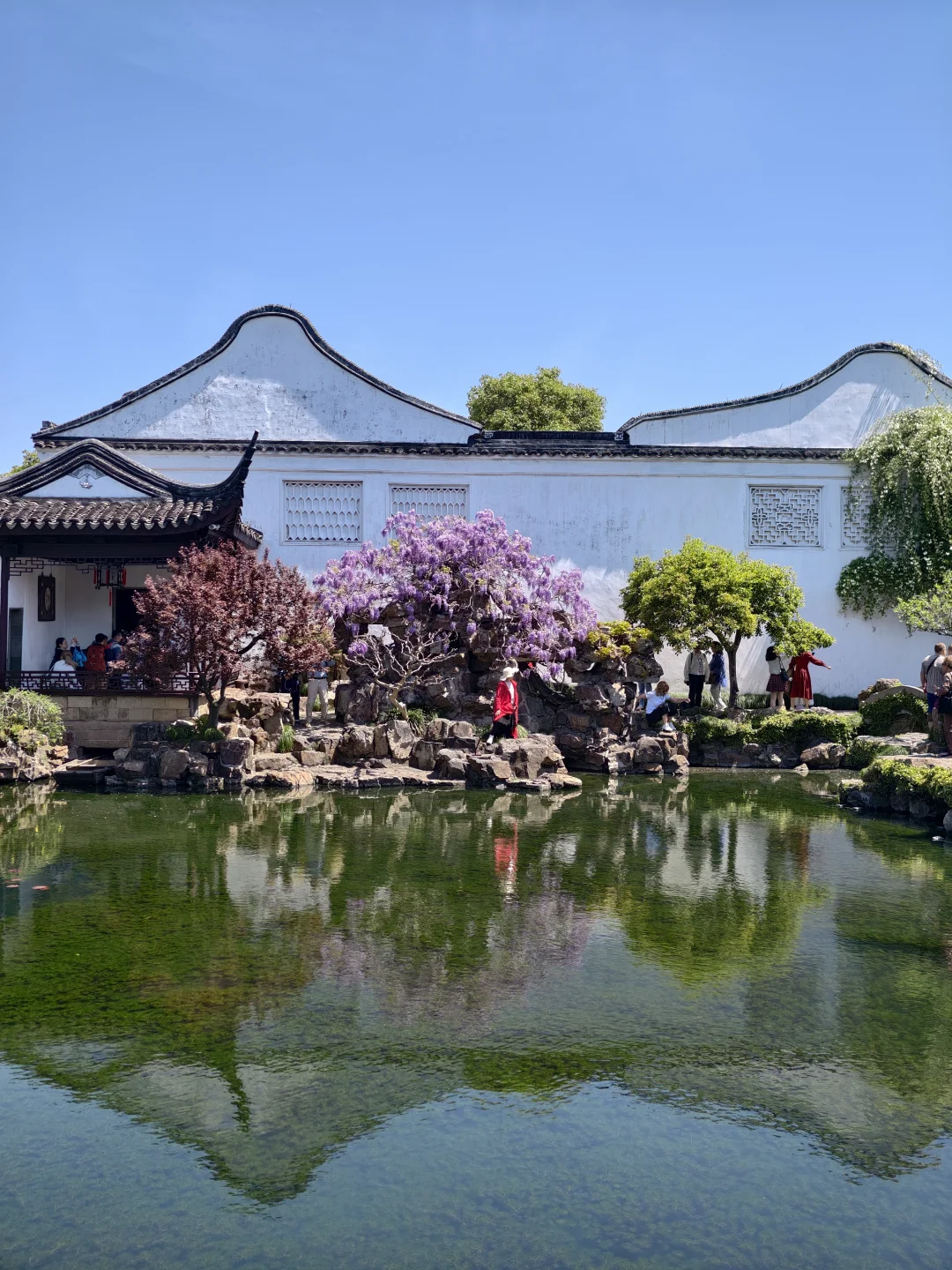 终于等到四月! 网师园的紫藤花开了, 苏州春日的紫色浪漫来袭! 虬枝缀紫,依石攀附, 远望像一盆天然盆景 从池对岸拍过去, 花影倒映水中, 紫影摇波, 古建的飞檐和白墙衬着垂落的紫色花穗, 果然紫色有韵味!!!! -