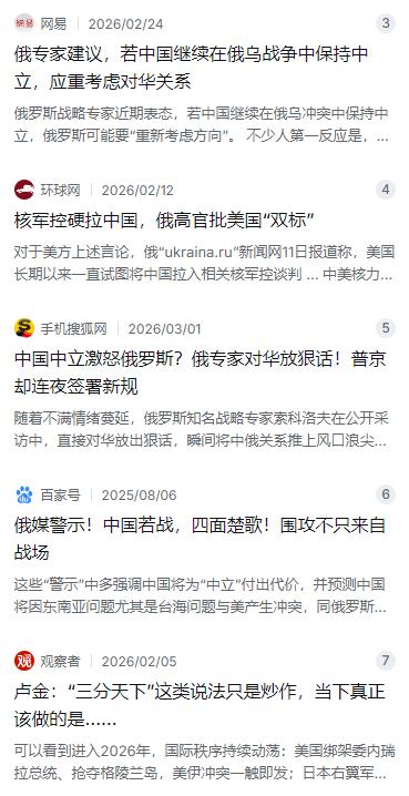 “中国将为‘中立’付出代价!”俄罗斯专家放话警告中国,一旦中美发生冲突,俄罗斯打算“袖手旁观”! 麻烦看官老爷们右上角点击一下“关注”,既方便您进行讨论和分享,又能给您带来更多优质的内容,感谢您的支持! 俄罗斯国内部分专家学者接连发声,对中国在俄乌冲突中坚持中立立场表达不满。有俄战略专家公开表示,如果中国继续在俄乌冲突中保持中立,俄罗斯可能不得不“重新考虑对华关系”。还有专家进一步警告,一旦中美之间爆发军事冲突,俄方或将选择置身事外,因为中国在俄乌问题上当了“观察者”,轮到俄罗斯当“观察者”了。 这话乍一听挺吓人的,中俄不是背靠背的好伙伴吗,怎么突然就要翻脸了?实际上,这些声音更多反映了俄罗斯在长期冲突压力下的焦虑情绪,而非官方立场的转变。俄乌冲突从2022年2月打到现在,已经超过四年,西方制裁像滚雪球一样越滚越大。到2025年6月,各类对俄非贸易制裁已接近三万项,其中九成以上是冲突后新增的。俄罗斯多家大银行被踢出国际资金清算系统,约3500亿美元外汇储备被冻结,占俄外汇储备的一半。能源出口遭限制,欧洲市场基本关闭,科技和物流通道也被全面封堵。俄国内不少依赖进口技术的产业停摆,前线战事陷入僵局,兵源问题日益突出。在这种走投无路的情况下,俄方自然希望中国能提供更多支持。但中国始终坚守中立,不向任何一方出售武器,不直接介入冲突,这让俄国内一部分人觉得“中国不够意思”,急切的情绪便化作了话语中的抱怨。 把话说得再直白一点,这些所谓的“警告”,与其说是对中国的威胁,不如说是走投无路时的虚张声势。俄罗斯现在根本没有资本跟中国翻脸。数据摆在那里:中俄双边贸易额从2022年的1900多亿美元稳步攀升,2024年突破2400亿美元,2025年仍保持在2281亿美元的高位,连续三年站稳2000亿美元大关。俄化石燃料出口收入中,对华出口占比接近一半,中国早已是俄能源出口的核心支柱。双方还不断扩大绕开美元体系的交易,用人民币结算,连莫斯科的自动取款机都能直接取人民币了。俄罗斯如果真要“重新考虑对华关系”,能源卖给谁?被西方冻结的资产谁来帮忙绕开?经济上极度依赖中国的俄罗斯,嘴上放几句狠话可以,真要动真格,受伤的反而是自己。 更有意思的是,就在部分俄专家对中国放狠话的同时,普京签署了第821号总统令,要求申请俄罗斯长期居留的外籍人士必须签署至少一年兵役合同。这一举动显然是为了解决前线兵源不足的问题。但与此同时,普京还签署了另一项法令:2026年9月14日前,中国公民可免签入境俄罗斯,最长停留30天。一边是专家在媒体上抱怨施压,一边是官方出台实实在在的便利政策吸引中国游客和商人,这一硬一软之间,俄罗斯的真实态度已经很明显了——专家的话听听就好,不代表克里姆林宫的官方立场。 其实,俄国内部分专家的这种抱怨,背后反映的是中俄关系的一个本质特点:两国并非传统意义上的军事同盟,而是“不结盟、不对抗、不针对第三方”的战略协作伙伴。俄外长拉夫罗夫多次强调,中俄关系是平等的,建立在互相信任、互相支持的基础上,从不针对第三国。俄罗斯外交部发言人扎哈罗娃也表示,破坏俄中关系的企图注定失败,“可靠”和“信任”是两国关系的关键词。普京本人更是多次表示,中俄合作不针对任何第三方。所以,俄专家那些“要换方向”“重新考虑”之类的狠话,更多是个人情绪宣泄,不代表国家意志。 那么,万一中美真的发生冲突,俄罗斯会袖手旁观吗?客观分析来看,可能性确实不大。一方面,俄罗斯自身深陷乌克兰战场,西线战事消耗了大量军事资源,东部远东军区兵力吃紧,很难再开辟一个新战线。另一方面,中美冲突一旦爆发,对全球格局的影响是灾难性的,俄罗斯即便不想卷入,也很难真正置身事外——核大国之间的对抗,没有任何国家能独善其身。还有一点值得注意:中美冲突如果真的爆发,对俄罗斯来说未必全是坏事。美国在亚太方向投入过多精力,欧洲方向的压力自然会减轻,俄军在乌克兰战场上的处境反而可能得到缓解。所以,与其说俄罗斯会选择“袖手旁观”,不如说它更可能选择“审时度势”,看局势发展再做判断,而不是提前把自己绑在任何一方的战车上。 对中国来说,俄专家的这些表态确实是一个提醒。无论是抱怨还是警告,都说明在大国博弈中,没有永远的朋友,只有永远的利益。中国坚持中立,不选边站队,这是出于自身战略利益的考量——中国有十四亿人口,经济发展和民生稳定是头等大事,不可能为了帮俄罗斯打赢冲突而牺牲自身核心利益,更不可能被任何一方的情绪化诉求绑架。但中立不代表被动,更不代表可以放松警惕。中国需要持续强化战略自主能力,在经济、科技、军事等关键领域加快补短板,减少对外部力量的依赖。在大国博弈的棋局中,最可靠的保障永远是自己的实力。和平不是靠别人的承诺换来的,而是靠自己的拳头打出来的。这一点,中国人比谁都清楚。
