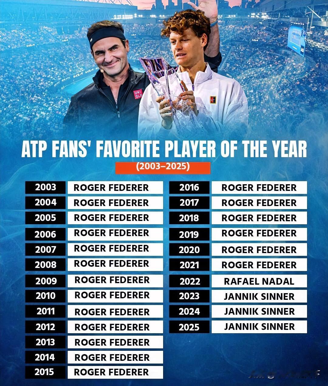 辛纳连续第三年荣获ATP球迷最喜爱年度球员奖🔥 这对吗👀,费德勒连续19年(2003-2021)ATP球迷最喜爱球员?辛纳 费德勒 纳达尔 德约科维奇