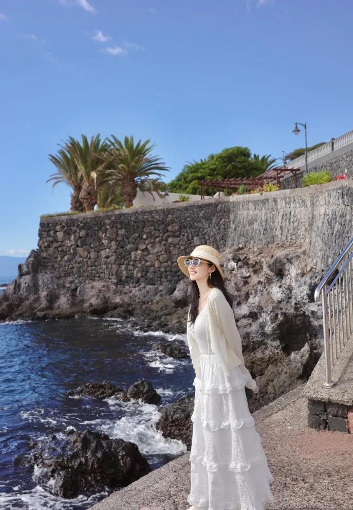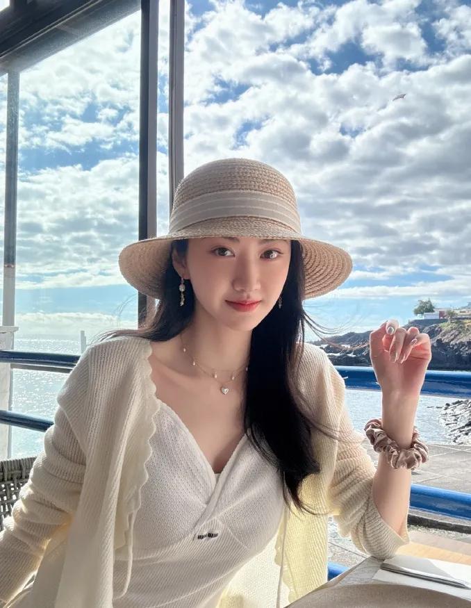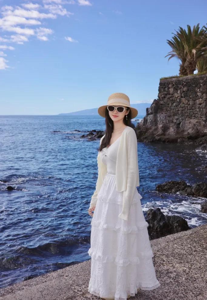 景甜海边私服也太绝了! 针织开衫搭吊带蛋糕裙,全白造型清爽又温柔✨ 宽檐草帽一戴,直接拿捏海边松弛氛围感~ 简约高级,这气质真的绝了! 景甜 明星私服 海边穿搭