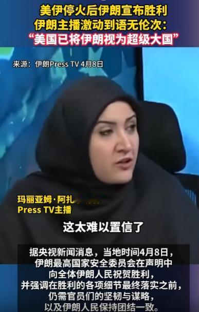 伊朗高调地喊着自己赢了!美伊俩家掐了这么久,说停就停了!而且更劲爆的是,停火的消息刚一出来,连电视台主播都激动到说不出完整的话,那兴奋劲儿,简直藏都藏不住! 2026年4月8号凌晨,美伊双方终于坐下来谈拢了,说好先停火两周,凌晨3点半的时候,停火就正式开始了。 不光这样,俩家还约好了,4月10号去巴基斯坦的伊斯兰堡,接着往下谈后续的事儿。 这消息一传到伊朗,整个国家都沸腾了,跟过年似的!伊朗最高国家安全委员会直接发了声明,明明白白说这是他们的历史性胜利,还说美国那边松口了,基本上同意了伊朗之前提的十个要求。 可能有人要问了,这十个要求其实说白了特简单,就是让美国别再随便拿捏伊朗,得承认伊朗能管霍尔木兹海峡,赶紧把对伊朗的制裁撤了,把在中东的部队挪走,还得赔伊朗之前受的损失。 最有意思的就是伊朗电视台的直播现场,主播一报这个消息,情绪直接崩不住了,激动到语无伦次,嘴里反复念叨着:“美国现在总算把伊朗当成超级大国看了!”那股自豪劲儿,隔着屏幕都能传染人。 不过话说回来,美国那边也不能丢面子,特朗普出来说,这次停火是因为美国已经达到了自己的军事目标,他们也没输,也是赢家。 说实话,在我看来,这根本就不是谁赢谁输的问题,说白了就是俩家都打累了,不想再耗下去了。 伊朗是真的硬气,扛住了美国这么久的压力,从头到尾没低头,最后还能争取到平等说话的机会,这本身就已经赢了。 而美国呢,说白了就是不想再陷进更大的麻烦里,一直耗着,对他们也没什么好处。 现在的停火也就是暂时的,后续的谈判才是关键,但不管怎么说,能停火就是好事,至少不用再有人因为冲突受伤了。 信息来源:观察者网《美伊停火后伊朗宣布胜利伊朗主播激动到语无伦次:“美国已将伊朗视为超级大国”》2026-4-8