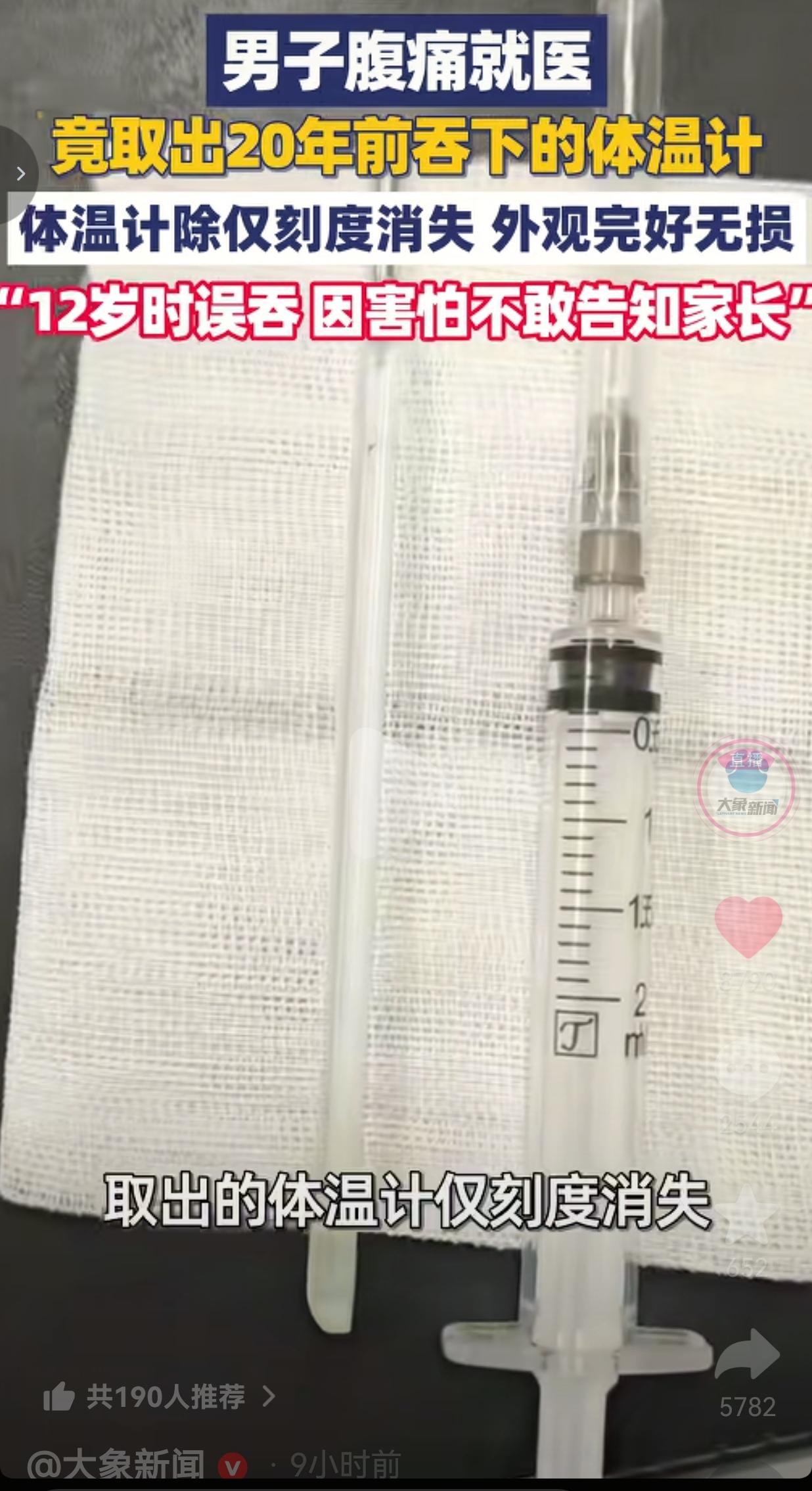 太吓人了!32岁的王先生因为肚子痛去趟医院,医生一查CT,好家伙——他的十二指肠里,卡着一根完完整整的水银体温计!这根“定时炸弹”,在他肚子里藏了整整20年! 事情是这样的:32岁的王先生最近总觉得肚子胀得慌,消化也不对劲,隐隐的疼实在扛不住了,才硬着头皮去医院。 医生给他做腹部CT的时候,盯着片子半天没敢眨眼——屏幕上,一根细长的金属影像直直杵在他的十二指肠里,前端死死抵在肠壁上,就像一把悬在半空的刀,随时可能戳穿肠壁,引发大出血,那可是分分钟要命的事! 医生赶紧追问病史,王先生憋了半天,红着脸说出了一个压了20年的秘密:这根体温计,是他12岁的时候不小心误吞的! 谁能想到,当年那个才上小学的孩子,吞完体温计第一反应不是哭着找爸妈,而是怕!怕被骂、怕被打,愣是把这个惊天秘密烂在了肚子里。 更离谱的是,吞下去之后他居然没立刻出现严重不适,家长又忙着上班疏于看管,这事就这么被彻底忘在了脑后,一忘就是20年! 直到这次腹痛,这根在他肚子里待了半辈子的体温计才终于被揪出来。 更让人咋舌的是,取出来的体温计除了刻度被磨得没了,玻璃管居然完好无损!里面的水银也没漏出来,不然以水银的剧毒,后果不堪设想! 一根十几厘米的玻璃体温计,跟着他吃饭、跑跳、长大、工作,悄无声息陪了他半辈子,这画面想想都头皮发麻。 这事一传开,评论区直接炸了,全是网友的震撼和后怕,句句说到心坎里: 有的网友说:“我的妈呀!这是把命攥手里玩了20年啊!换我吞下去当天就得吓哭找妈,这孩子咋能20年一字不提?心理素质硬得离谱,换我早疯了!” 也有的网友说:“作为医生真的气到发抖!每年都碰到孩子误吞异物不敢说的,小到硬币、别针,大到这种尖锐的!孩子不懂事,家长呢?20年啊!孩子身体有没有异常,当爸妈的一点没察觉?心也太大了!” 还有的网友说:“看傻了!这体温计在肚子里跟着肠胃蠕动,万一哪天玻璃碎了、水银漏了,直接重金属中毒、肠穿孔,人就没了!这哪是体温计,是催命符啊!居然揣了20年,命也太硬了!” 更有网友表示:“看完赶紧抱紧我家娃!以后孩子不管闯啥祸,哪怕吞了东西,绝对不能先骂!先解决问题才是正经的!孩子一害怕藏起来,那就是一辈子的隐患,太吓人了!” 说实话,我看完这事儿没有半分庆幸,只觉得满心的后怕和悲哀。 首先心疼当年的小男孩。12岁正是怕挨骂的年纪,误吞了这么危险的东西,他第一反应是隐瞒而非求助,这说明在他心里,告诉爸妈的后果,比肚子里插着一根体温计更可怕! 这是家庭教育多大的悲哀啊?孩子的恐惧,从来都不是凭空来的,是一次次被指责、被责骂吓出来的。 其次,这20年的“平安无事”,纯粹是老天爷赏饭吃,是极致的侥幸!水银体温计是玻璃做的,尖锐又易碎,里面的汞更是剧毒。 20年里,只要肠胃蠕动稍微猛一点、体温计稍微磕碰一下,管子碎了、水银漏了,王先生的人生早就戛然而止了。 他能活到32岁,全是运气爆棚,根本不是什么值得开心的“奇迹”! 最后我真的忍不住想说:家长的失职,才是这场闹剧的根源!孩子吞了东西,20年里真的一点异常都没有吗?不可能!只是家长忙着赚钱、忙着工作,把孩子的身体和情绪抛在了脑后。 一个孩子肚子里藏着这么大的秘密,当爸妈的居然一无所知,这不是疏忽,是彻头彻尾的失职! 这件事给所有家长敲了个血淋淋的警钟: 孩子成长路上,最可怕的从来不是犯错,而是“犯了错不敢说”。 别用打骂把孩子推得远远的,别让“怕挨骂”,成为孩子藏起伤口、隐瞒危险的理由。一根体温计能藏20年,但孩子藏在心里的恐惧和不安,可能会藏一辈子。 最后我想说的是:真正的爱,是让孩子敢在犯错时,第一个奔向的人是你,而不是躲起来独自扛下所有。 对此,你怎么看?