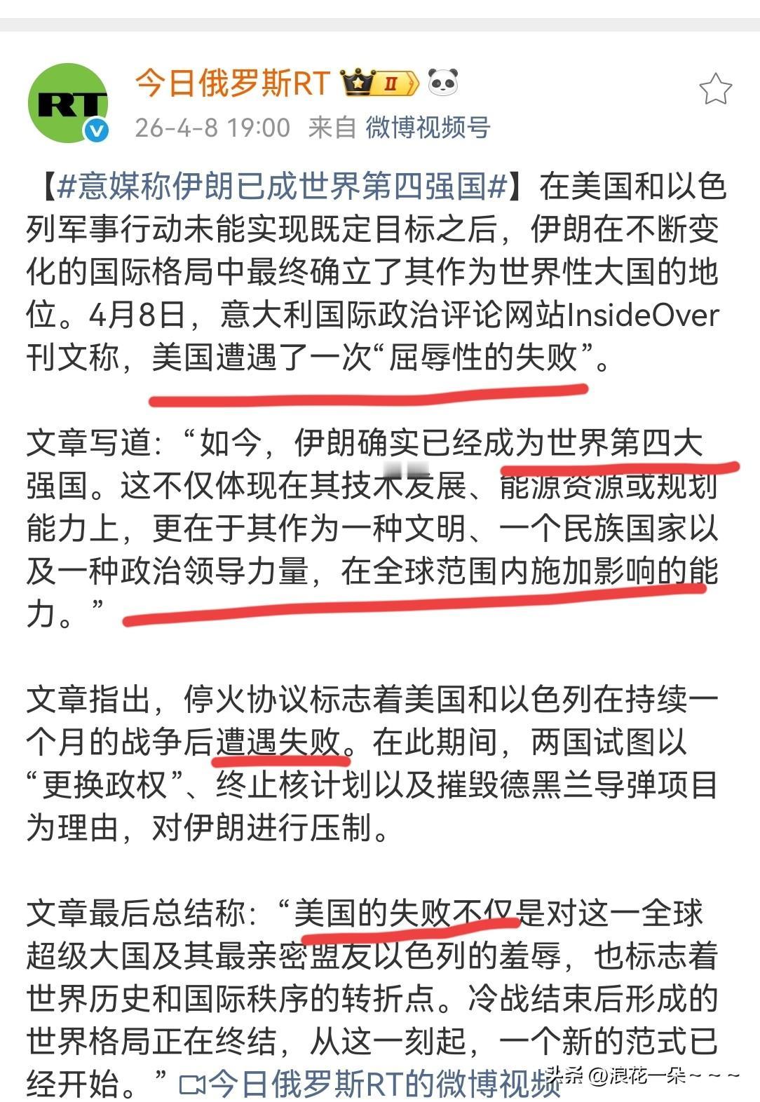 哦豁!就在刚刚, 意大利🇮🇹媒体称,伊朗已成为世界第4强国?美国遭遇了一场“屈辱性失败”? 要我说伊朗真是打个一拳开,免得百拳来。不管怎么说,这次停火首先是美国先提出来的,先同意的。美国对伊朗的10项停火条件也是知道的。 所以说,意大利媒体说美国遭遇了一场“屈辱性失败”也不为过,虽然特朗普政府不这么认为,也许是当局者迷,旁观者清吧?