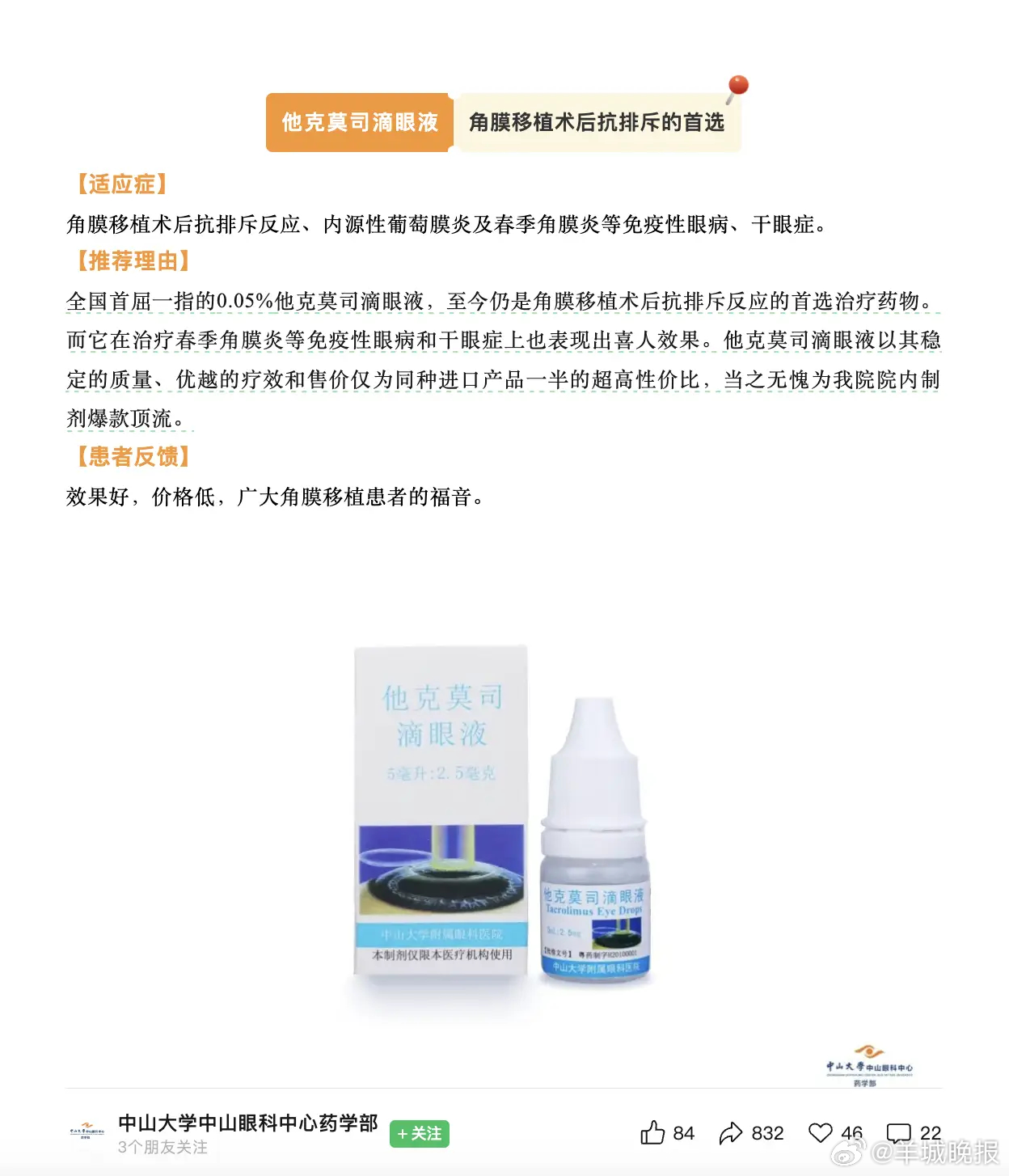 “记者帮”在社交平台搜索发现,有网友曾发布一款包装写有“中山大学附属眼科医院”“本制剂仅限本医疗机构使用”的他克莫司滴眼液。据悉,该滴眼液是由中山大学中山眼科中心(中山大学附属眼科医院)药师与医生团队合作研发的一款国内独家——用于角膜移植术后抗排斥反应治疗的眼药水。