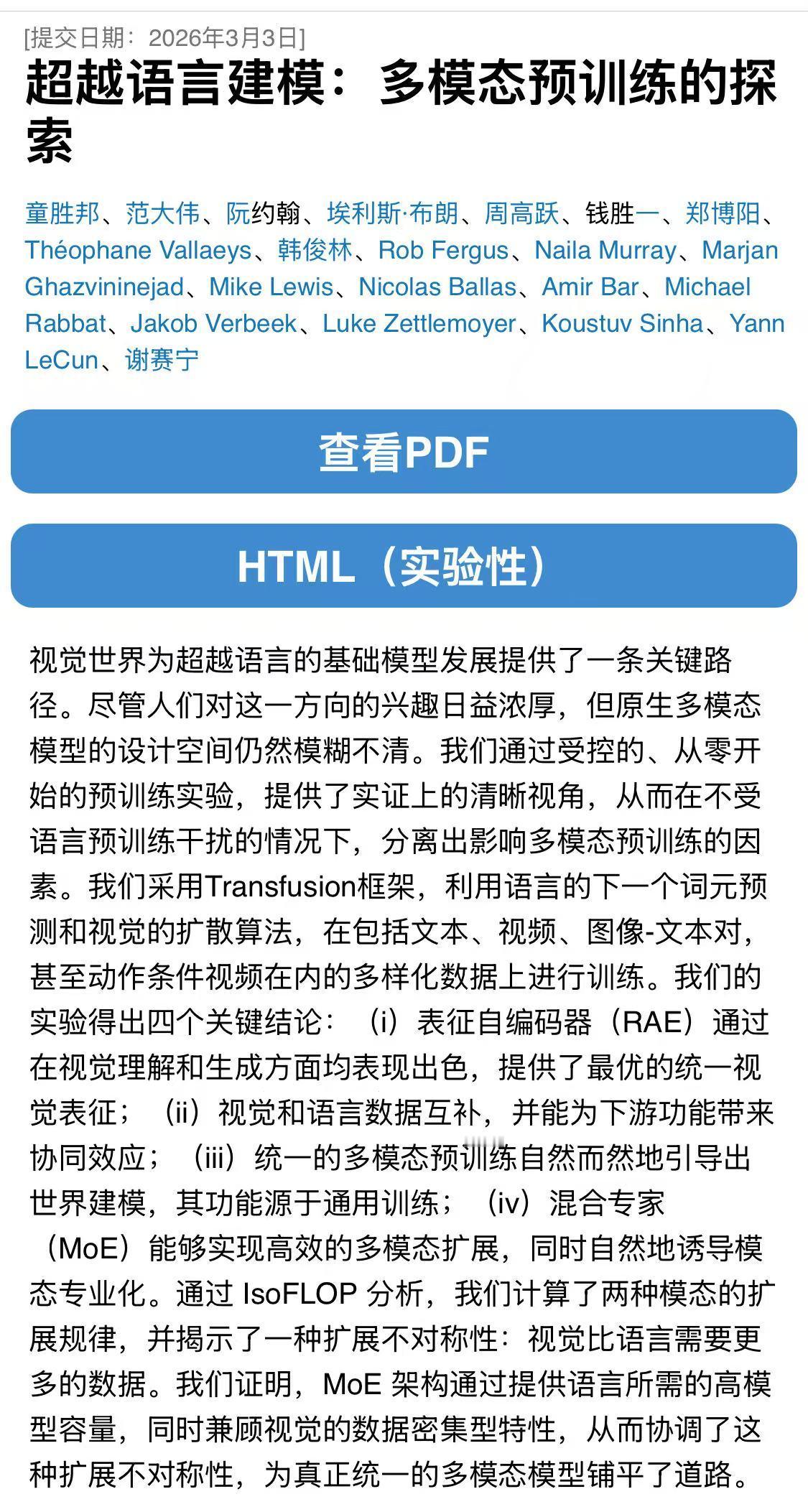 杨⽴昆和谢赛宁在最新发表的论⽂中,就引⽤了某国产模型的技术报告,指出尽管使⽤了旨在⿎励均匀利⽤的辅助负载均衡损失,但统⼀多模态预训练分配给⽂本的专家数量仍显著多于视觉专家。