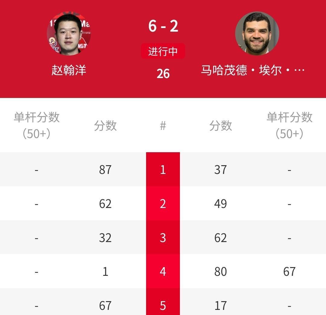 6-2,狂轰115-0、73-0,中国选手赵瀚洋遥遥领先!北京时间4月8日晚,刚刚结束2026年斯诺克世锦赛资格赛144进112轮次,中国选手赵翰洋与马哈茂德-埃尔-哈雷迪的第一阶段较量中,他以6-2的比分领先对手四局,为晋级下一轮奠定坚实基础。双方第二阶段的争夺,将在明天凌晨2:00开始,赵瀚洋如果延续这样的状态,晋级希望非常大。不过,赵瀚洋必须吸取吴宜泽在巡回锦标赛6-2领先韦克林,第二阶段被轰八连鞭,6-10惨遭逆转的教训。那么,就让我们期待赵瀚洋的好消息!赵心童 你如何看待赵瀚洋决胜局绝杀? 丁俊晖