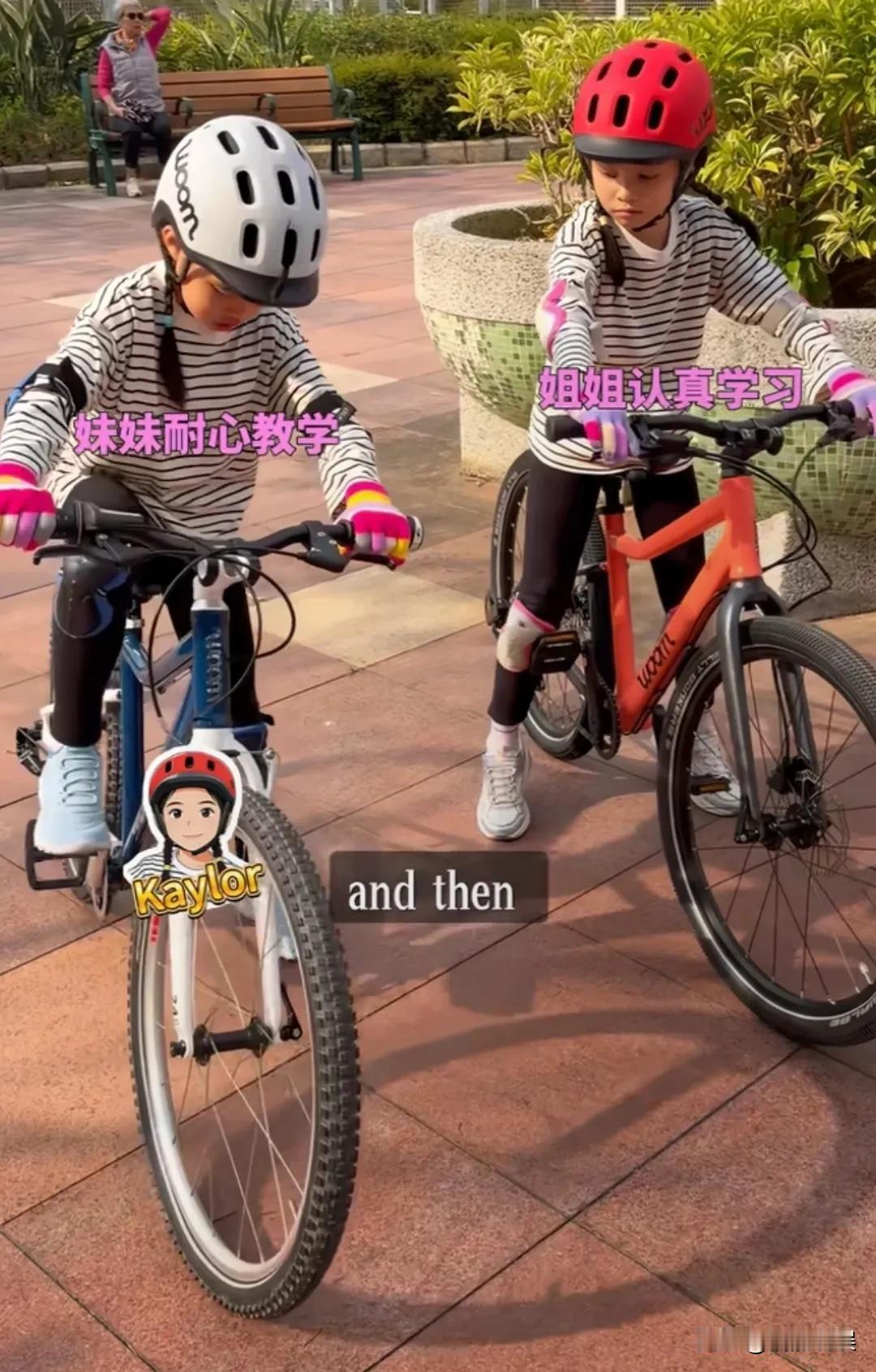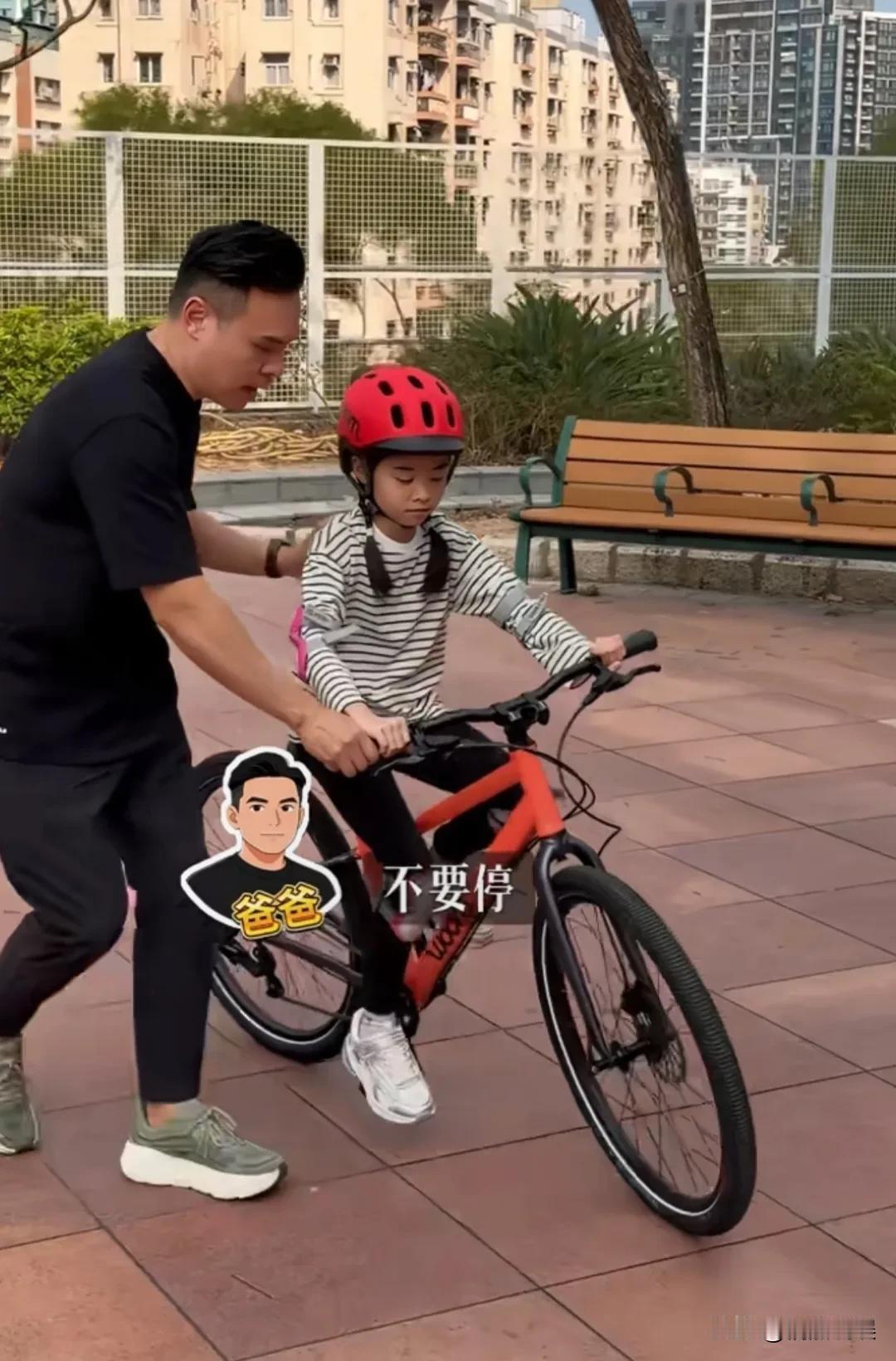 熊黛林和老公郭可颂带着两个双胞胎女儿去学踩单车,感觉她两公婆好同频啊,肉眼可见俩人的婚姻好幸福。 双胞胎姑娘长得一点也不一样,姐姐戴着红色头盔,双眼皮大眼睛小脸蛋,眉眼很像妈妈;妹妹戴着白色头盔,单眼皮翘嘴唇,眉眼更像爸爸。 不过妹妹的学习能力更强,性格也很坚强,摔倒了也不哭,很快就学会了踩单车。 熊黛林日常看着保养得非常好,状态很年轻,粤语说得还挺不错,有时还会用英语和孩子交流。 两个孩子学骑车摔倒了,夫妻俩一致认为孩子不摔跤学不会骑单车。尽管俩人在一旁有些担心,但还是放手让孩子自己去体会。 这一点挺好的,没有过度呵护,学会放手。看郭可颂和老婆熊黛林说话,温声细语的,面对问题俩人选择一起讨论,有商有量,挺同频的。