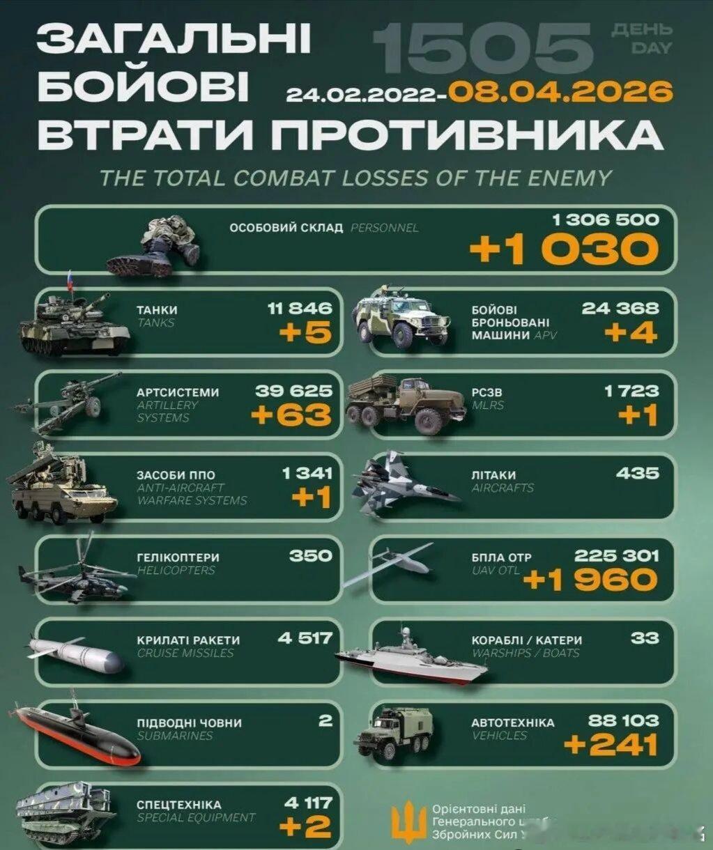 乌俄战争进入第1505天,乌克兰总参谋部发布战报:过去24小时俄军发动进攻94次,其中11次在胡利亚伊波列(11次在苏梅)、22次在康斯坦丁诺夫卡、6次在利曼、31次在波克罗夫斯克、13次在南顿涅茨克区域。毙伤俄1030名。俄军累计损失1306500人。摧毁俄5辆坦克、4辆装甲车、63门火炮、1个火箭发射装置、1套防空系统、1960架大型无人机、241辆军车、2件特种设备。