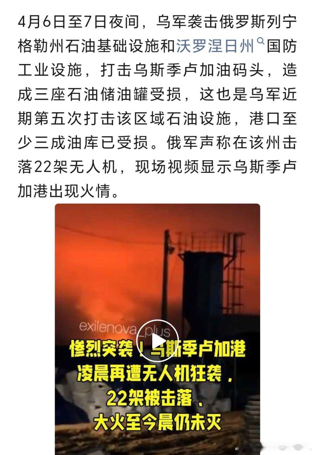 4月7日,乌远程无人机夜间袭击了波罗的海沿岸列宁格勒州俄乌斯季卢加石油码头,造成3座石油储罐受损并引发火灾。该港口是俄波罗的海核心能源枢纽,年石油吞吐量约3500万吨,占俄海运量20%,前天刚刚恢复石油出口装载作业。此次袭击使港口再次瘫痪,至少三成油库受损,每日约70万桶石油出口受阻。此前3月该港曾连续遭袭,大火蔓延至芬兰湾,导致航班中断。乌通过改装无人机实现超远程打击,凸显俄后方基础设施防御短板。