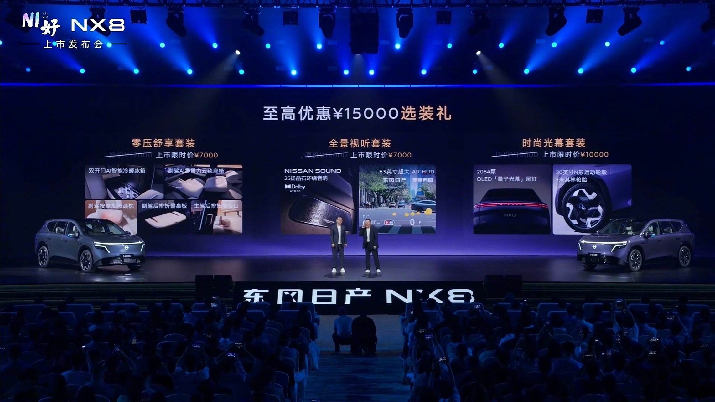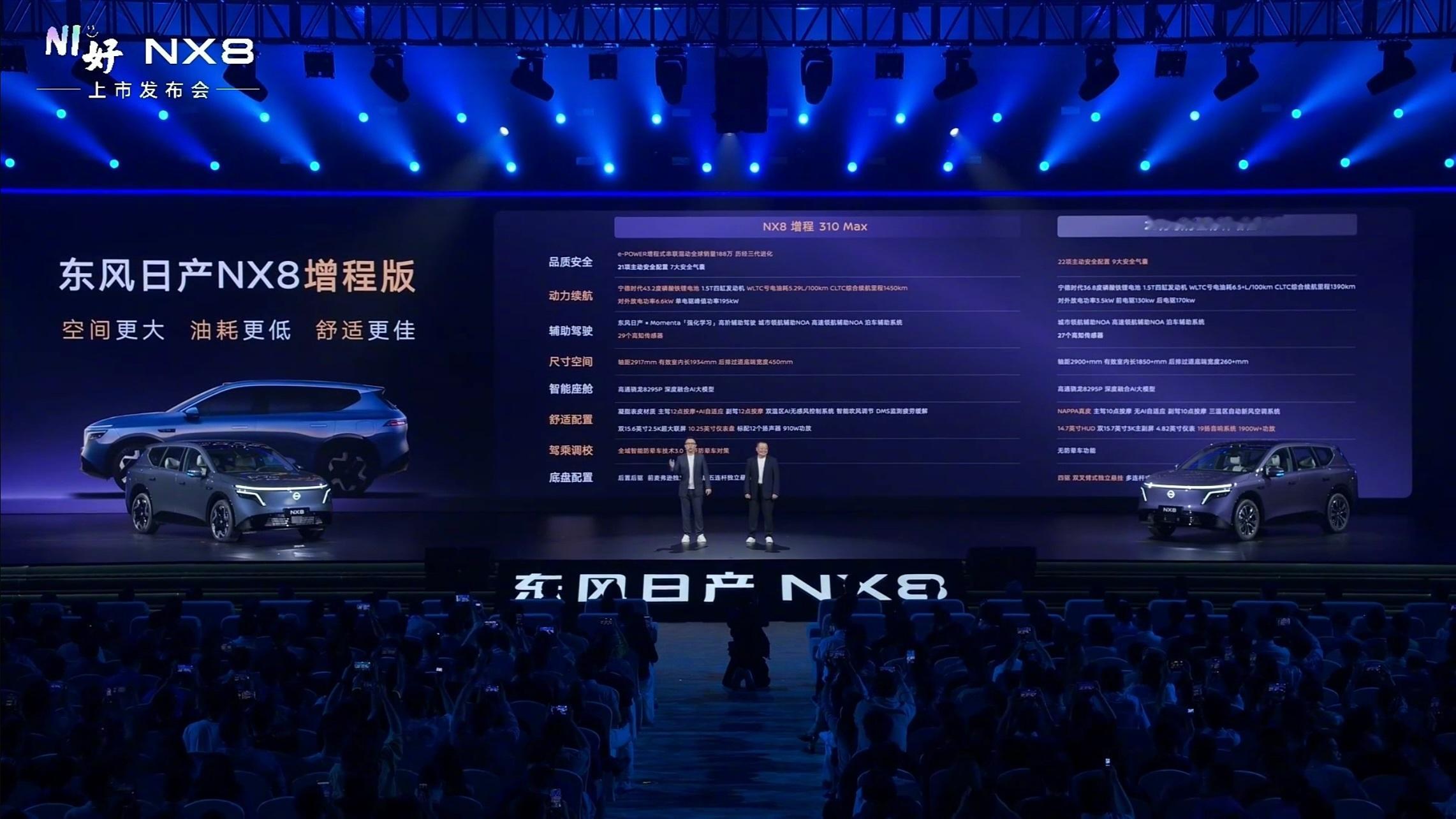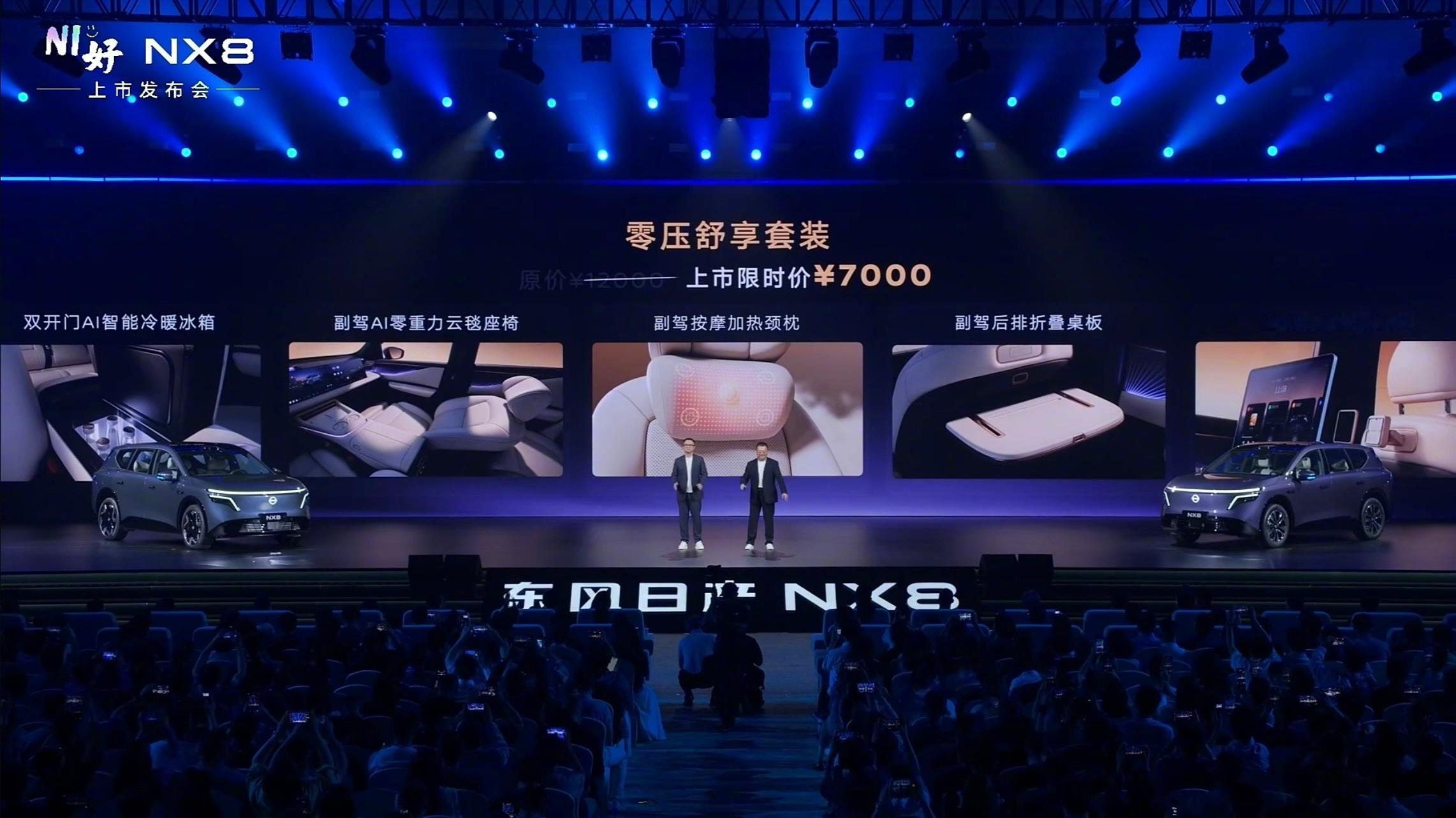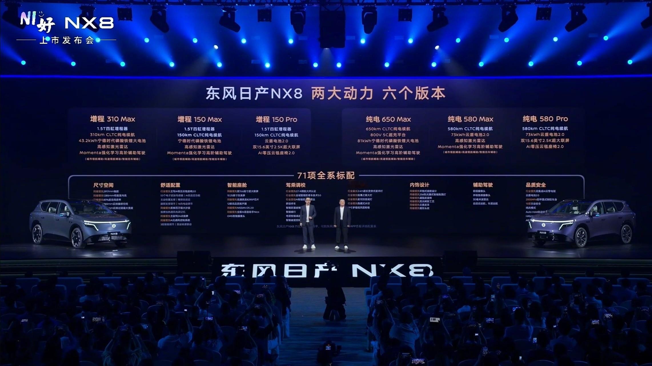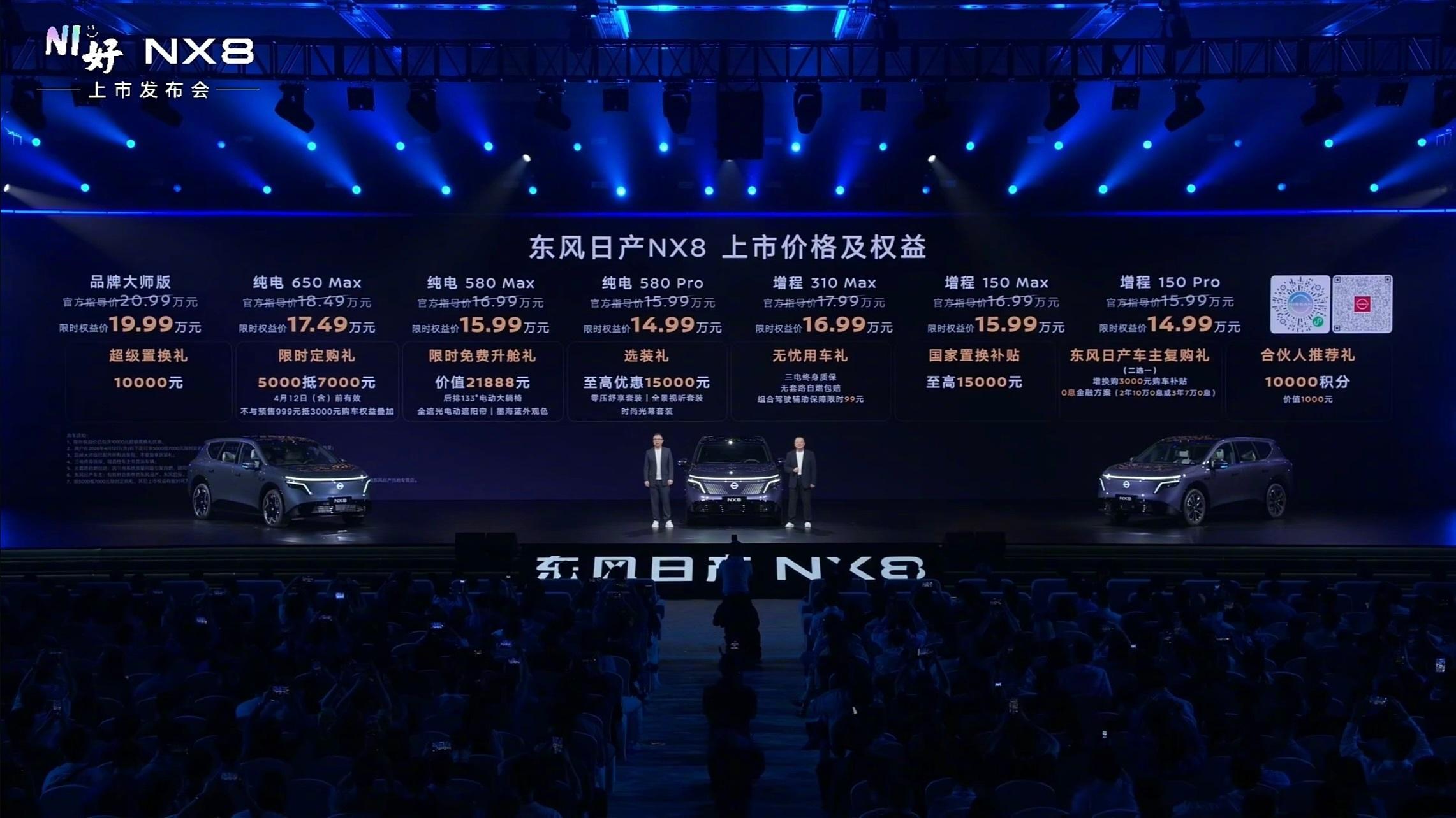 配置与价格信息(权益价)东风日产NX8纯电580 Pro:14.99万元东风日产NX8纯电580 Max:15.99万元东风日产NX8纯电650 Max:17.49万元东风日产NX8增程150 Pro:14.99万元东风日产NX8增程150 Max:15.99万元东风日产NX8增程310 Max:16.99万元东风日产NX8品牌大师版:19.99万元东风日产NX8大大大五座NX8售14.99万起