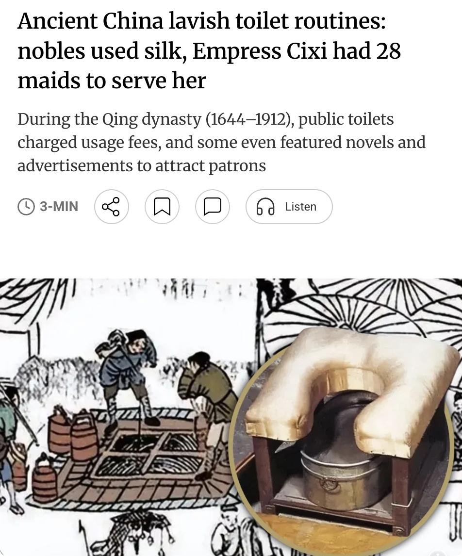 外媒:古代中国如厕习俗差异悬殊:平民用树叶、石块或瓦片清洁,贵族则以丝绸或布料擦拭,并配备名为"厕筹"的精致竹木条(部分以金玉制成,用后清洗晾干,但因质地坚硬使用不便)。 据《南唐录》记载,后主李煜曾亲自为僧人准备厕筹,并以脸颊测试光滑度。清代(1644-1912)公共厕所甚至收费经营,内设小说和广告招徕顾客,而慈禧太后如厕时更有28名宫女侍候,将私密行为变成彰显身份的繁复仪式。