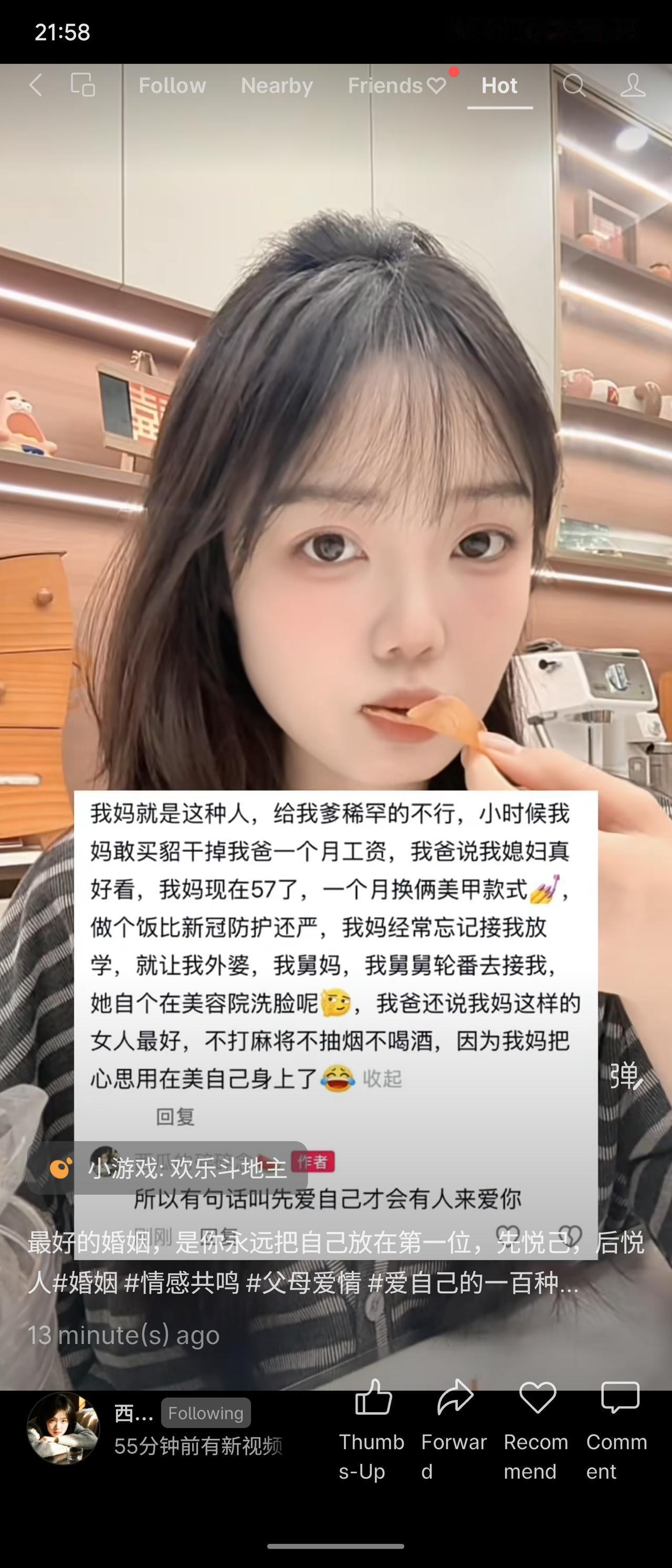一位网友分享父母爱情:母亲爱美,买貂、做美甲、泡美容院,甚至忘记接孩子;父亲却十分欣赏。作者评论:先爱自己,才会有人来爱你。婚姻中把自己放在第一位,方能悦己悦人。