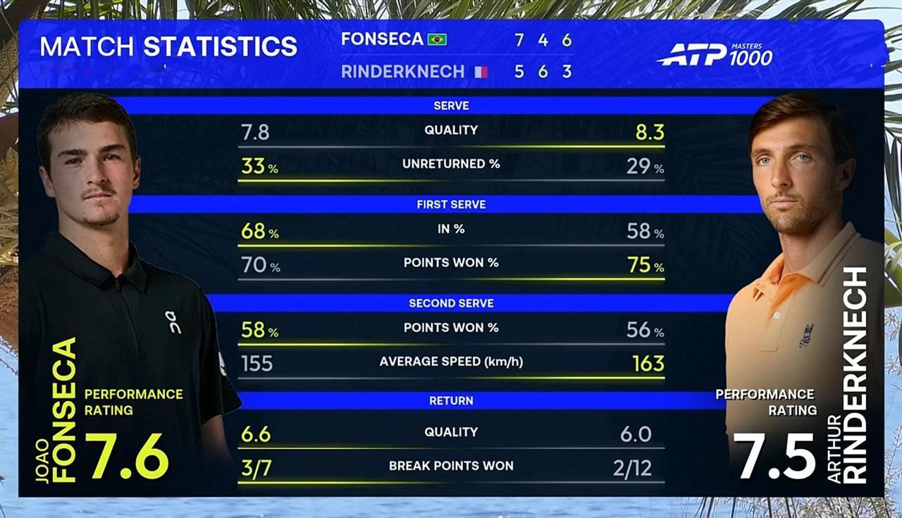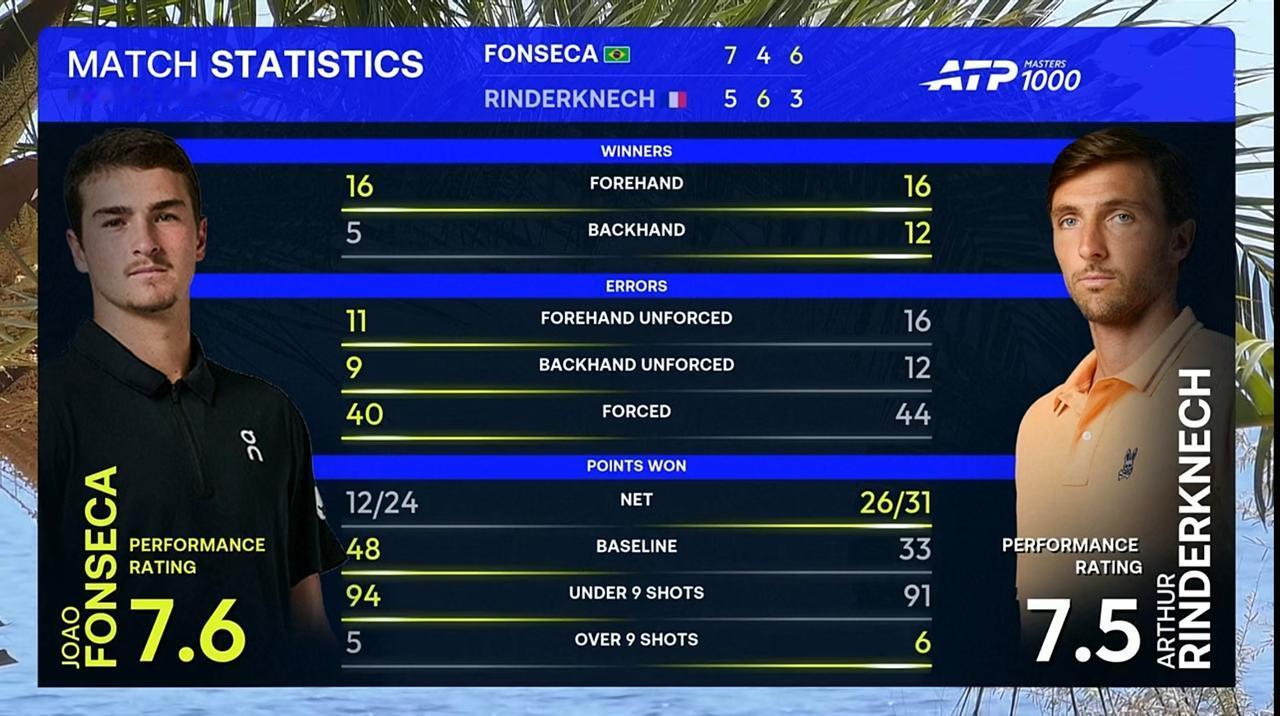 新生代丰塞卡蒙特卡洛大师赛第二轮波折中击败表哥林德克内希 北京时间2026年4月8日,蒙特卡洛大师赛第二轮,新生代丰塞卡对阵表哥林德克内希。 结果,耗时2小时32分钟,激战三盘,丰塞卡以2:1的比分击败表哥林德克内希,晋级第三轮。 第一盘。 前三局各自保发,转折点发生在第四局,丰塞卡逼出一个破发点,随即兑现破发,3:1。第七局,林德克内希逼出连续两个破发点,在对手挽救一个破发点后兑现破发,3:4。第十一局,丰塞卡被林德克内希逼出一个破发点,经历三次平分,化解三个破发点,错失一个局点,最终艰难保发,6:5。第十二局,林德克内希非保不可发球局,错失两个局点,经历三次平分,挽救一个盘点,耗时6分多钟,最终遭遇破发。 7:5,丰塞卡拔得头筹。 第二盘。前四局各自保发,转折点发生在第五局,林德克内希:逼出连续三个破发点,在对手挽救一个破发点后兑现破发,3:2。第十局,林德克内希发球胜盘局,小遇挑战,保发成功。 6:4,表哥林德克内希扳回一城。大比分1:1平。 第三盘。前七局各自坚守住自己的阵地,转折点发生在第八局,丰塞卡逼出一个破发点,在对手挽救破发点后再次拿到破发点,随后兑现破发,5:3。第九局,丰塞卡发球胜赛局,小遇挑战,成功保发。 6:3,丰塞卡再下一城,大比分2:1,丰塞卡击败林德克内希,晋级第三轮。