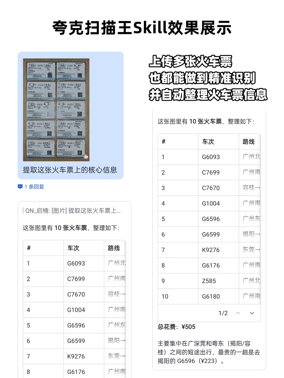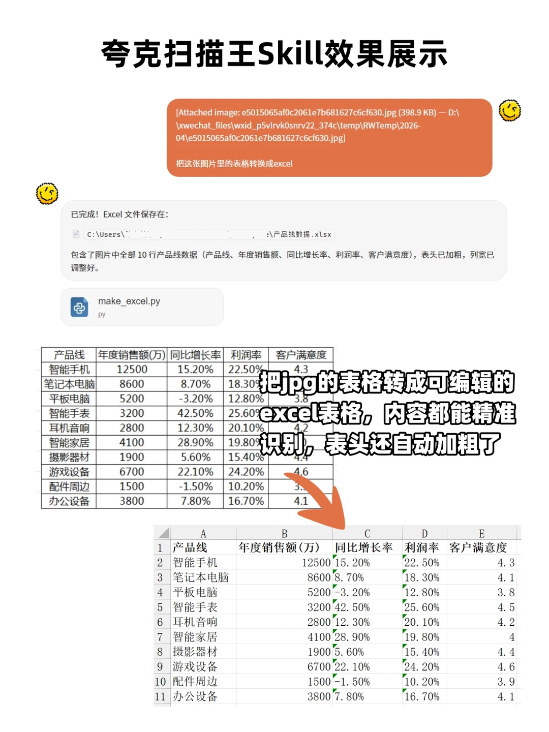3、图片转officeSkill(yescan-transoffice-universal):以前图片转换出来的Word和Excel,排版碎得像拼图,自己还要再花大半修改格式,现在用夸克扫描王的Skill,格式还原得很完整,不用再手动调整,几分钟就搞定了。