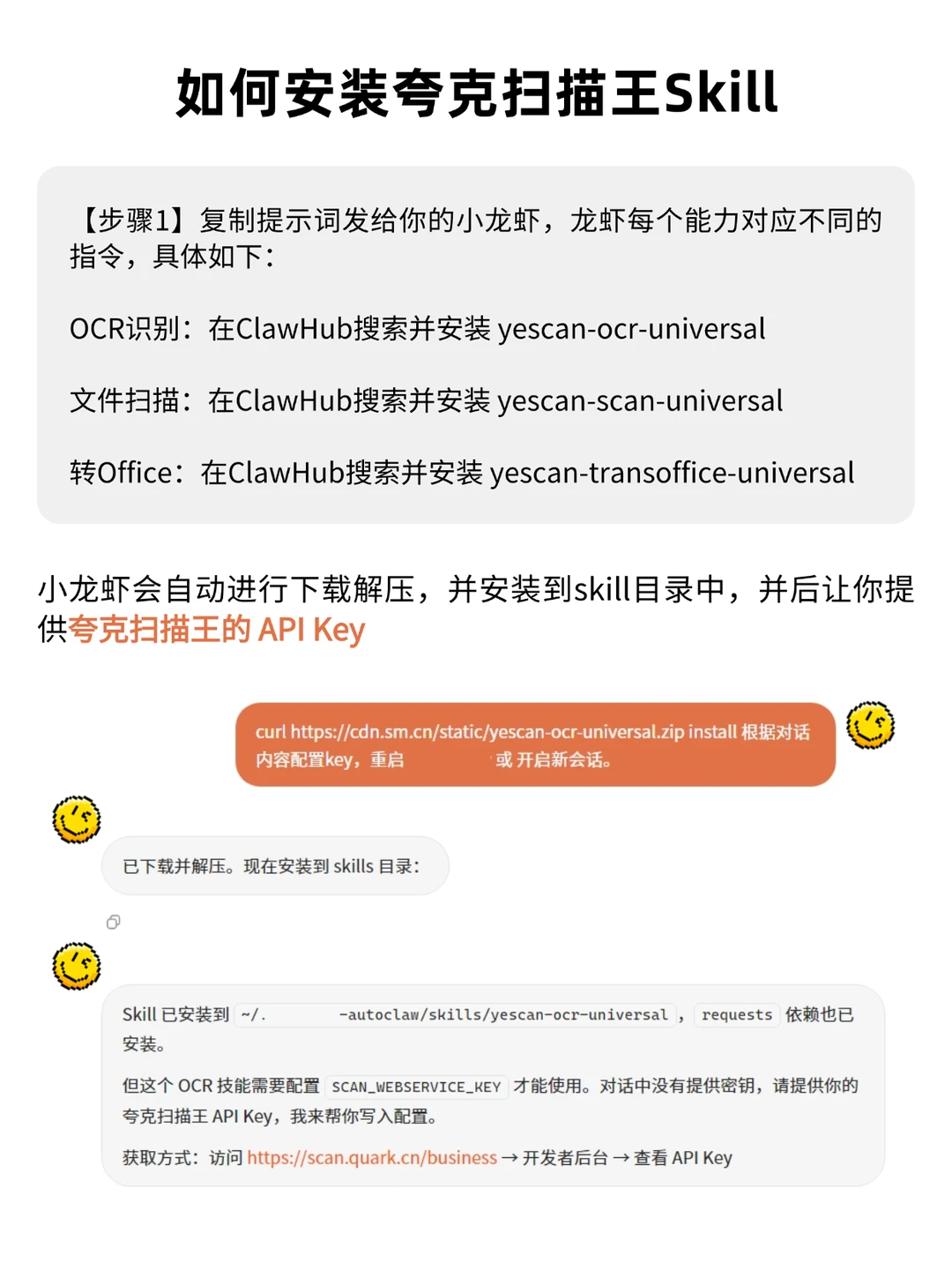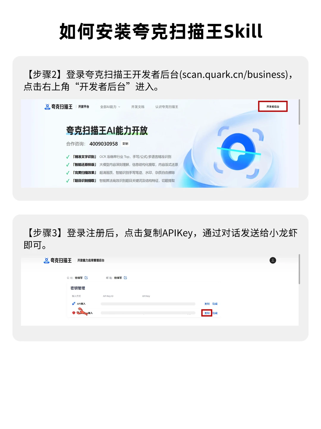除了上面这三大🦞专用能力,夸克扫描王这次还一口气开放了30余项API能力!大家可以去开放平台自行探索一下,基本能覆盖大部分的文档处理场景,自由度极高。把这套技能接入龙虾的步骤也超级简单: