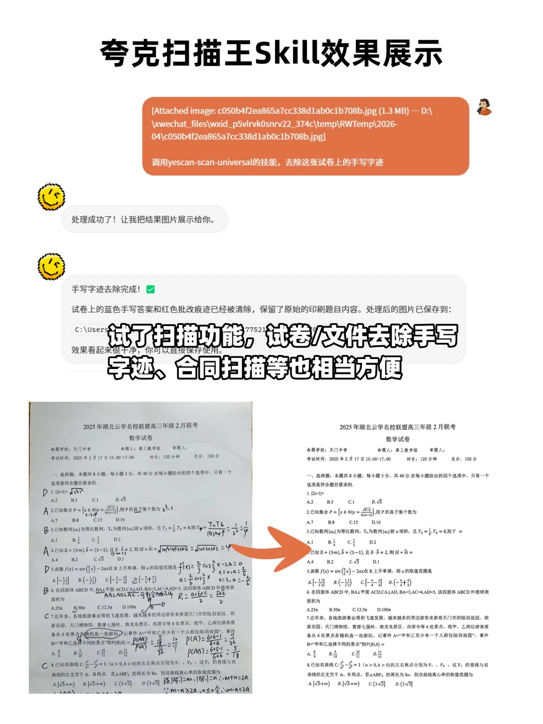 2、文件扫描Skill(yescan-scan-universal):这个在工作和生活中就更加常见了,合同签署、资料保存、试卷去除手写字都可以用到这个扫描功能,平时很多纸质材料容易丢失,扫描后成电子档之后,不管是存档还是后续打印都很方便。