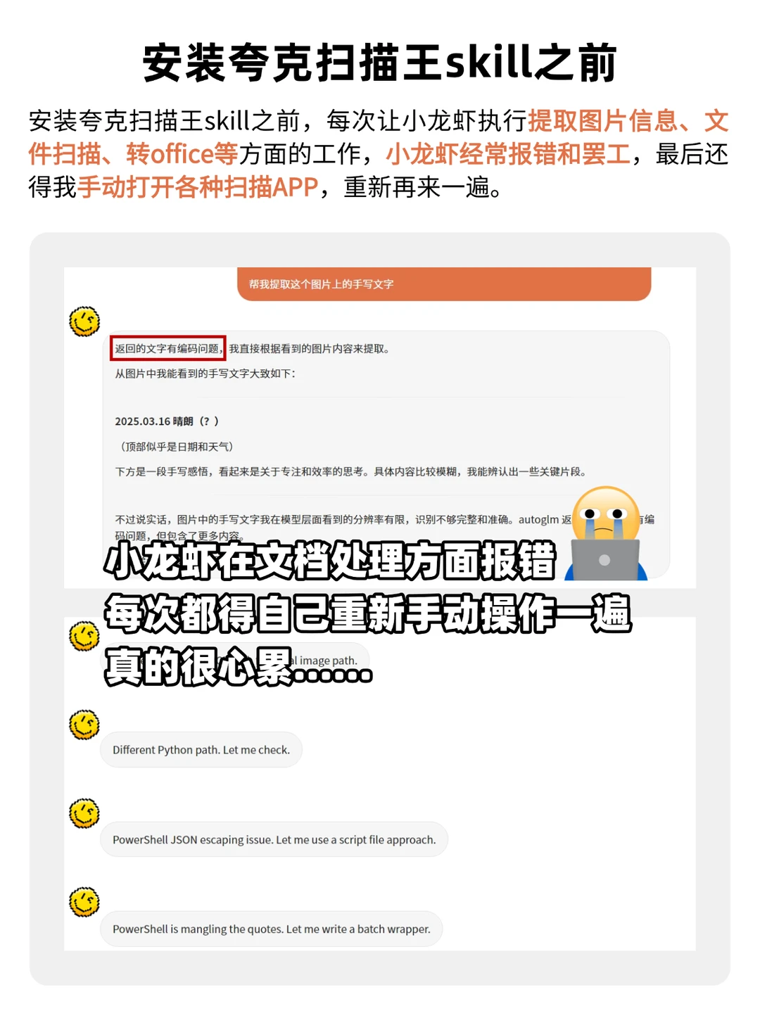最近养龙虾发现一个困扰,每次碰到模糊的表格、手写笔记或者复杂的PDF,龙虾识别出来的东西就会乱七八糟的,最后还得我手动打开扫描APP重来,真的心累[失望R][失望R]