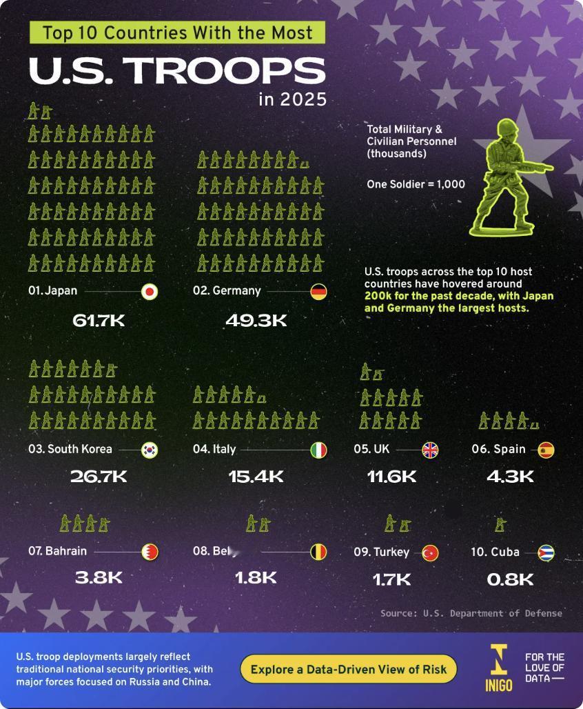 外媒:2025年美国海外驻军最多的10个国家依次为:日本(6.17万人)、德国(4.93万人)、韩国(2.67万人)、意大利(1.54万人)、英国(1.16万人)、西班牙(0.43万人)、巴林(0.38万人)、比利时(0.18万人)、土耳其(0.17万人)和古巴(0.08万人)。 这10国合计驻军约20万人,过去十年保持稳定。 驻军分布体现美国战略重心:日本、韩国针对东方大国,德国、意大利、英国等锚定欧洲以应对俄罗斯,巴林则支撑中东海军行动。