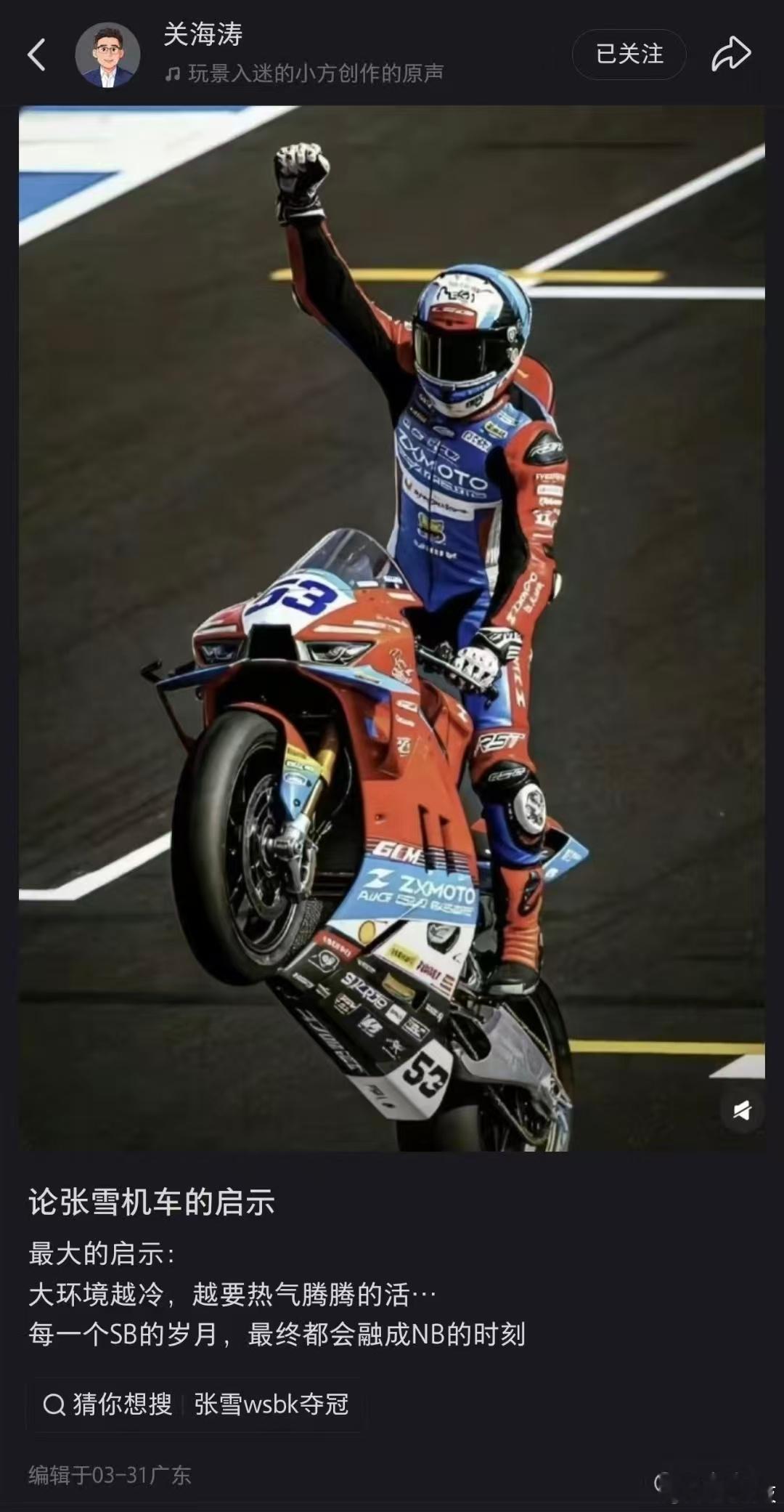 在世界顶级大赛上,中国品牌从来不是来当背景板的!张雪机车在WSBK葡萄牙站直接拿下双料冠军,把杜卡迪、雅马哈这些老牌巨头都给赢了,让全世界都见识了中国机车的真正实力。更燃的是,4月8号荣耀正式宣布成为张雪机车在WSBK的首席战略合作伙伴。这下好了,两个中国品牌一起站上世界最高领奖台,用实力说话——中国制造,真的崛起了!荣耀张雪机车战略合作