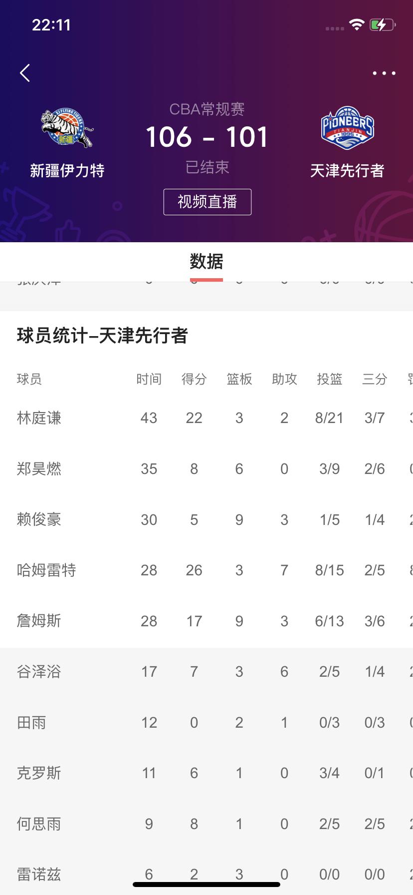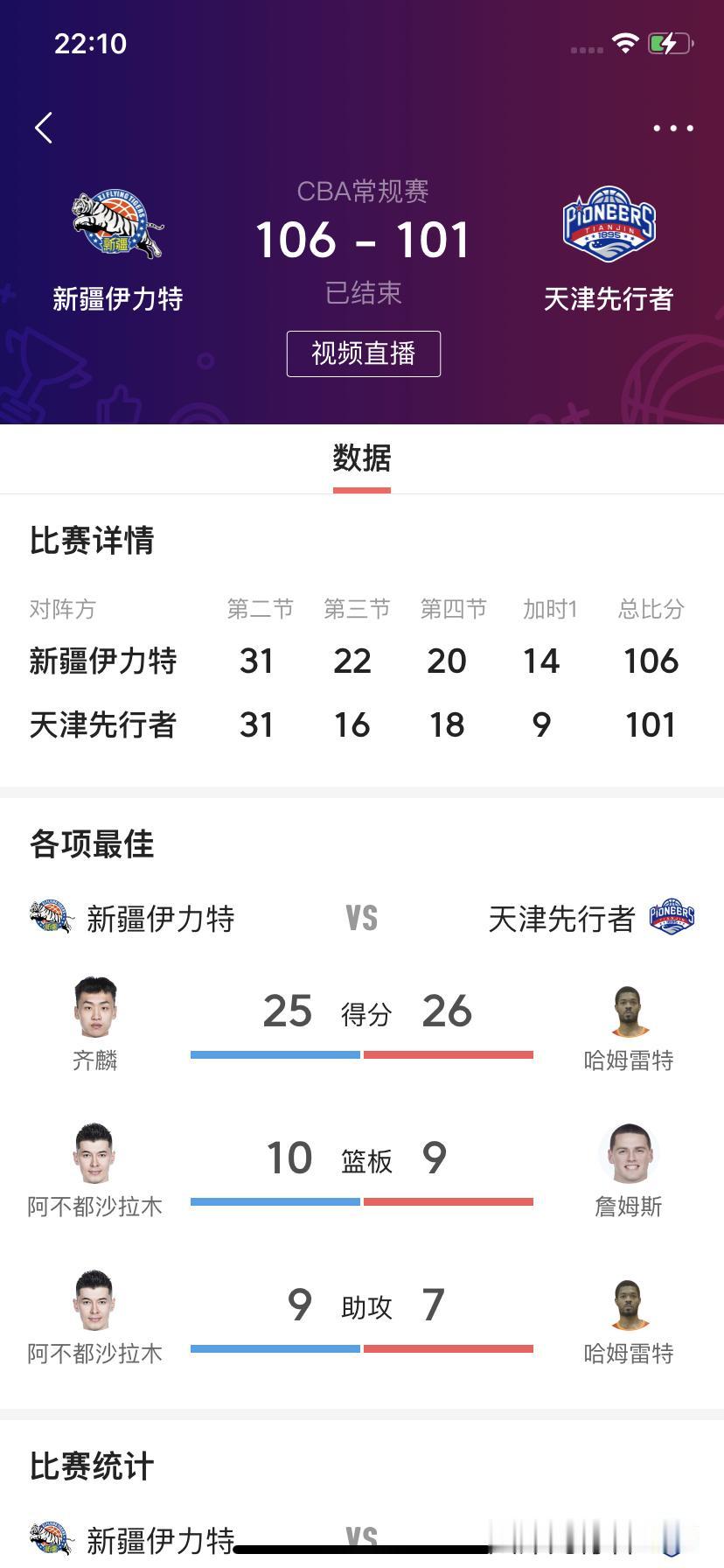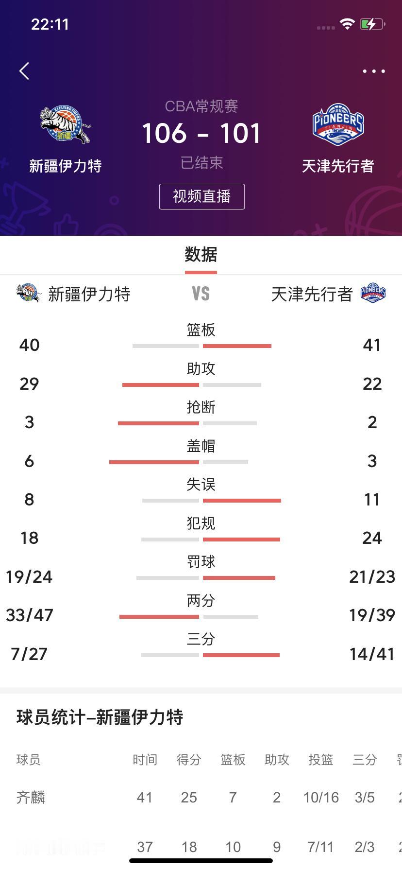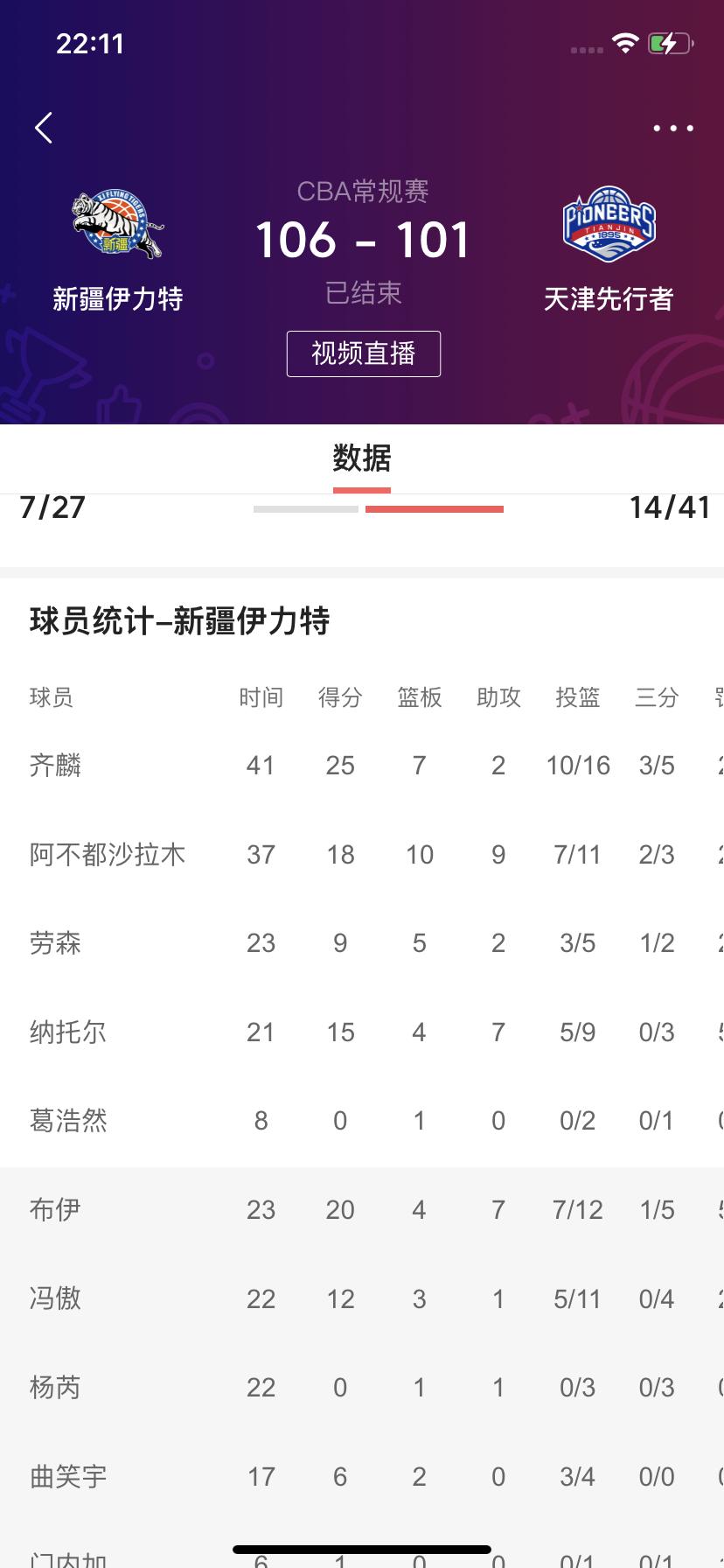 心脏真的是受不了了! 新疆飞虎男篮最终通过加时赛以106比101战胜了客场挑战的天津先行者男篮! 纵观全场比赛,新疆飞虎男篮赢得非常惊险!全场比赛大部分时间都是落后。 这场比赛新疆飞虎男篮5名球员得分上双,齐麟得到的全队最高的25分,还有布依的20分,沙拉木的18分、纳托儿的15分,冯傲的12分。 加油新疆飞虎男篮!争取在后面的比赛好好的打撒!
