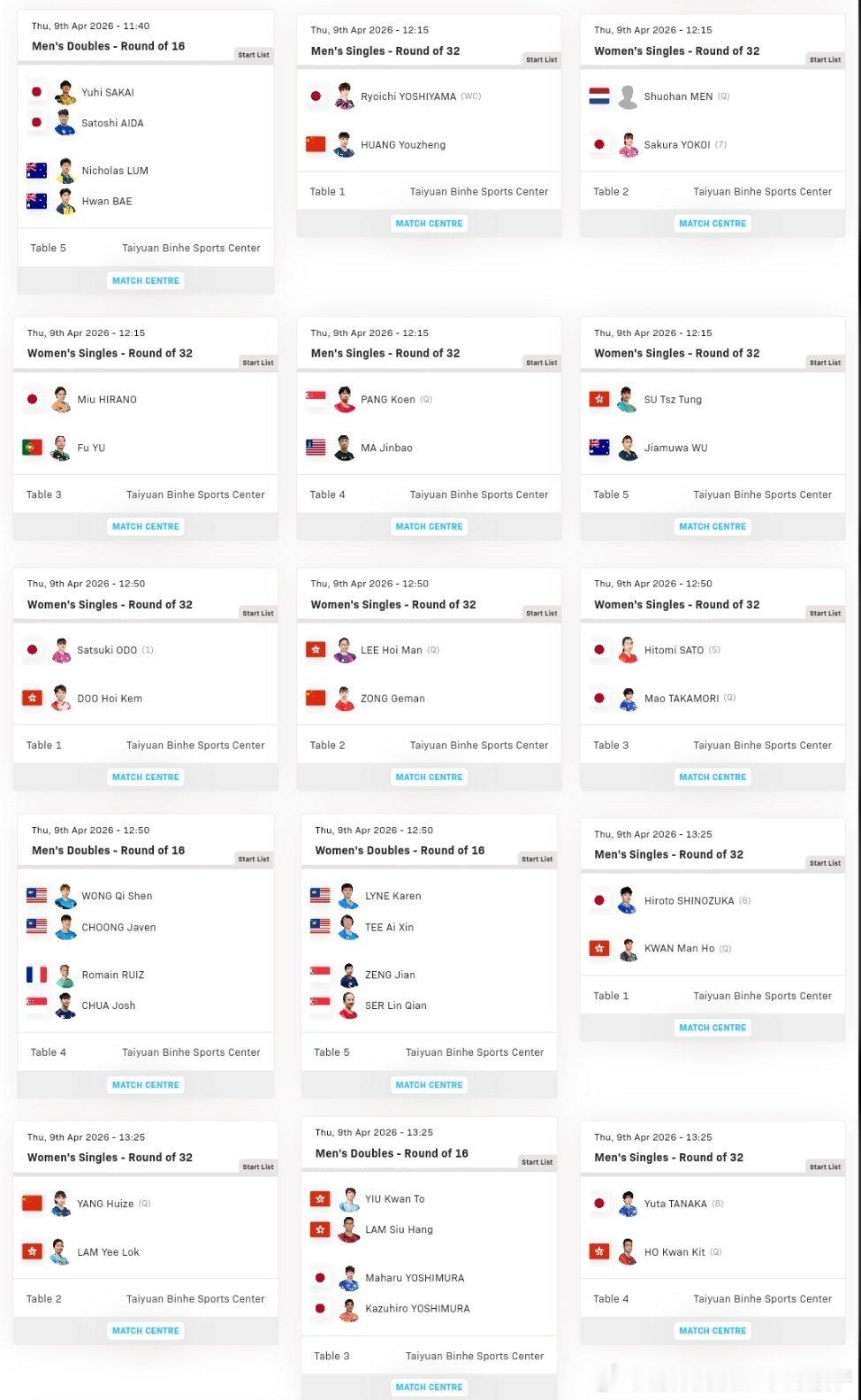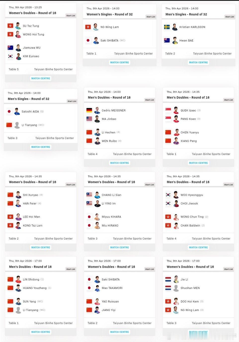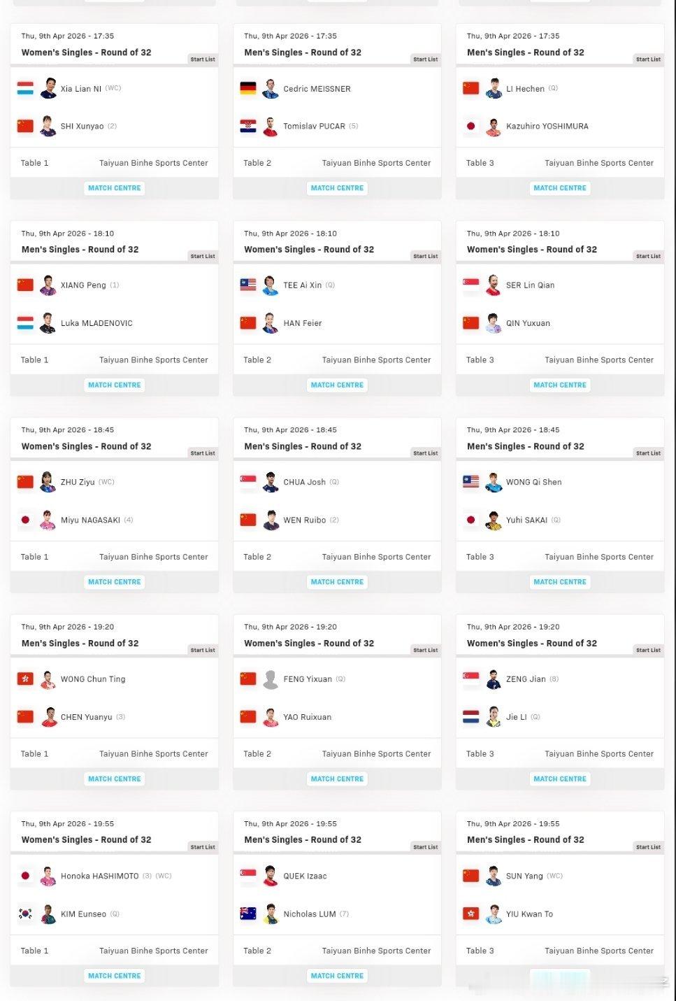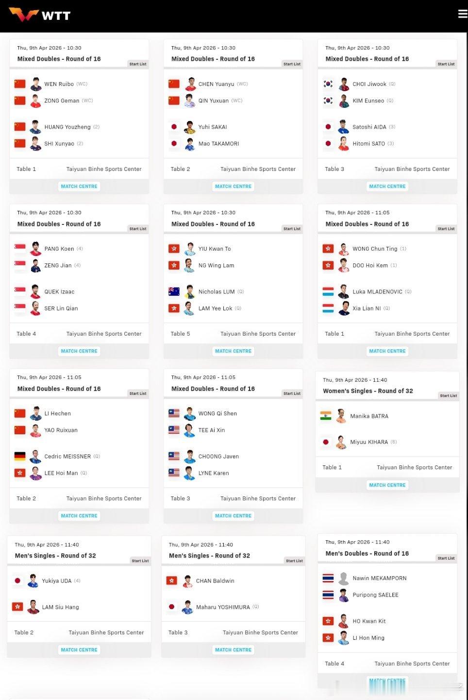 2026WTT太原常规挑战赛第一比赛日赛程:4月9日10:30 混双 T1:温瑞博纵歌曼🇨🇳VS黄友政石洵瑶🇨🇳10:30 混双 T2:陈垣宇覃予萱🇨🇳VS坂井雄飞高森爱央🇯🇵11:05 混双 T2:李和宸姚睿轩🇨🇳VS迈斯纳🇩🇪李凯敏🇭🇰12:15 男单 T1:黄友政🇨🇳VS吉山僚一🇯🇵12:50 女单 T2:纵歌曼🇨🇳VS李凯敏🇭🇰13:25 女单 T2:杨惠泽🇨🇳VS林依诺🇭🇰14:00 男单 T2:李天阳🇨🇳VS英田理志🇯🇵14:00 男双 T4:李和宸温瑞博🇨🇳VS迈斯纳🇩🇪马金宝🇺🇸14:35 男双 T1:陈垣宇向鹏🇨🇳VS郭勇冯耀恩🇸🇬14:35 女双 T2:石洵瑶韩菲儿🇨🇳VS李凯敏江芷林🇭🇰