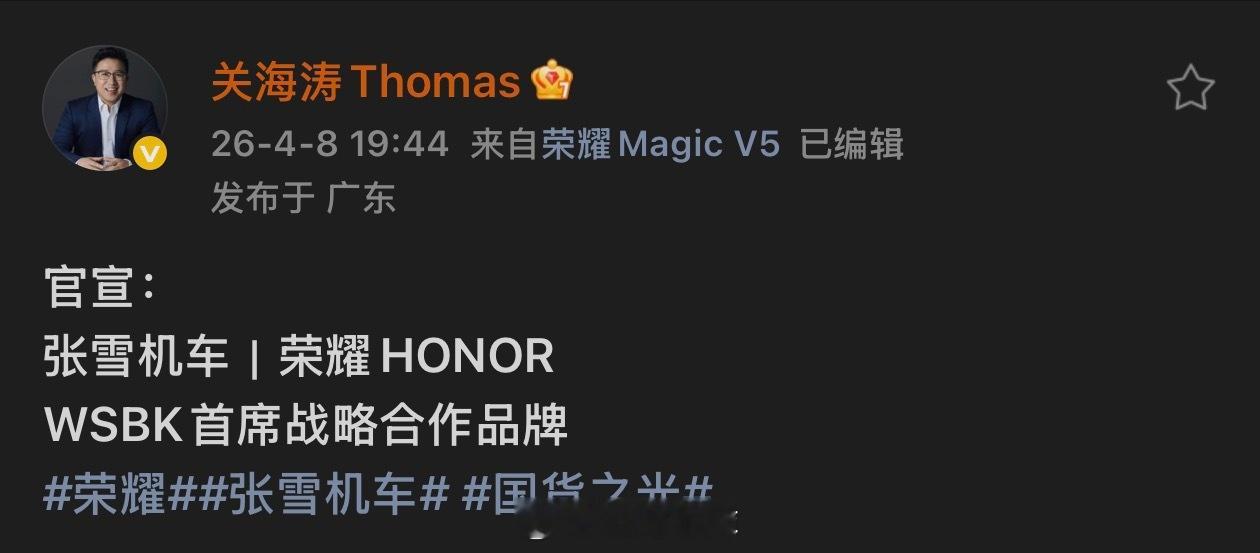 关海涛宣布,荣耀和张雪机车达成合作,荣耀正式成为张雪机车首席战略合作品牌。