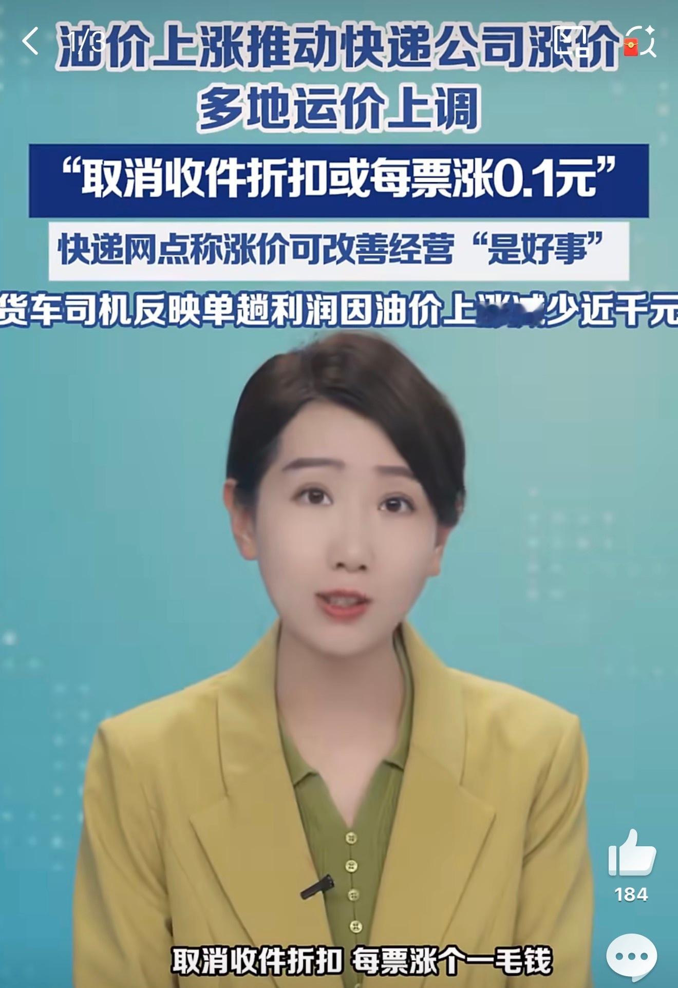 快递 涨价我感觉快递费涨价合理啊!油价涨了,快递全凭车大江南北的运输,车不得加油,油价涨了,这带来最直接的就是成本上升,成本上升只能转嫁到客户身上。