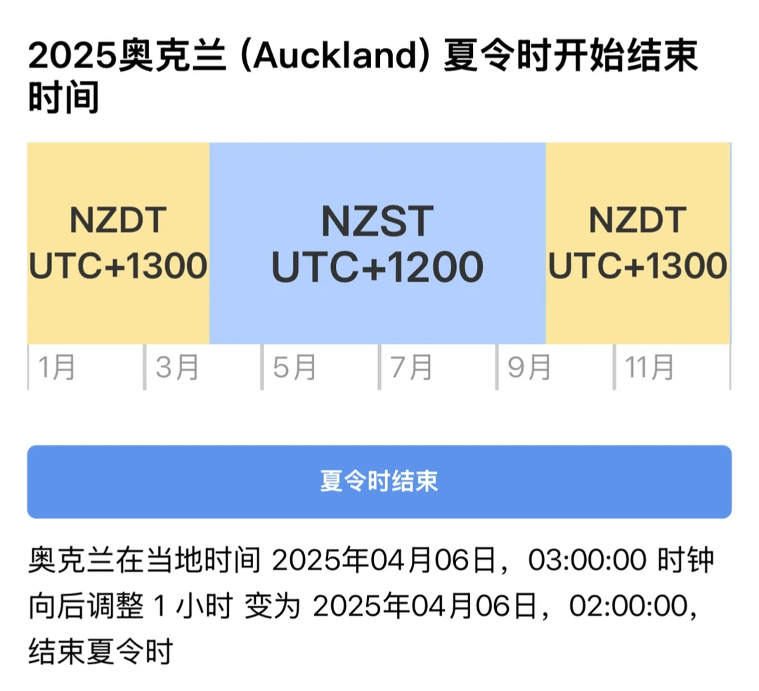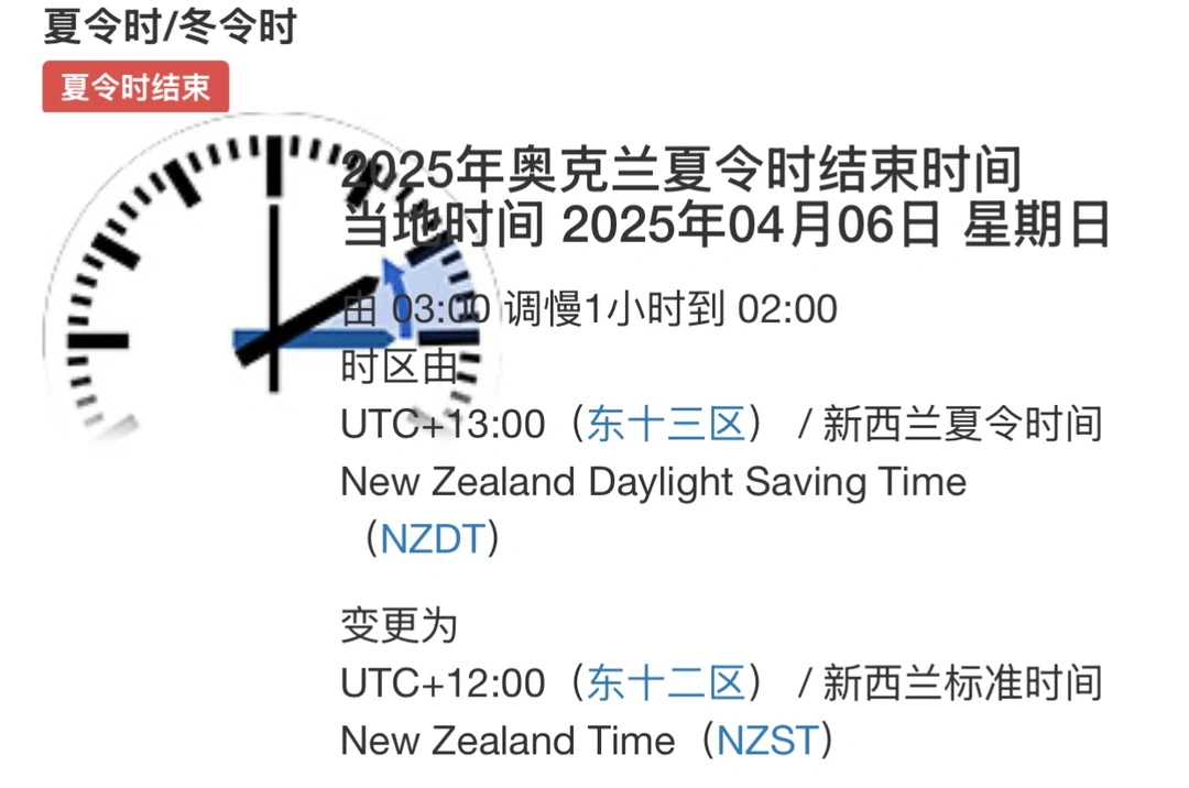 要珍惜最后夏天的小尾巴啦!新西兰即将进入冬令时啦[皱眉R] [仙女R]奥克兰在当地时间 2025年04月06日,03:00:00 时钟向后调整 1 小时 ,变为 2025年04月06日,02:00:00, 进入冬令时,结束夏令时! 和中国相差4小时! 也意味着,大家可多睡一小时[大笑R] [扯脸H][扯脸H]智能手机和其他数位设备上的时钟会自动更动,但非智能的时钟和手表类产品将需要自己进行更改[扶额R] 关注我,下一篇更精彩