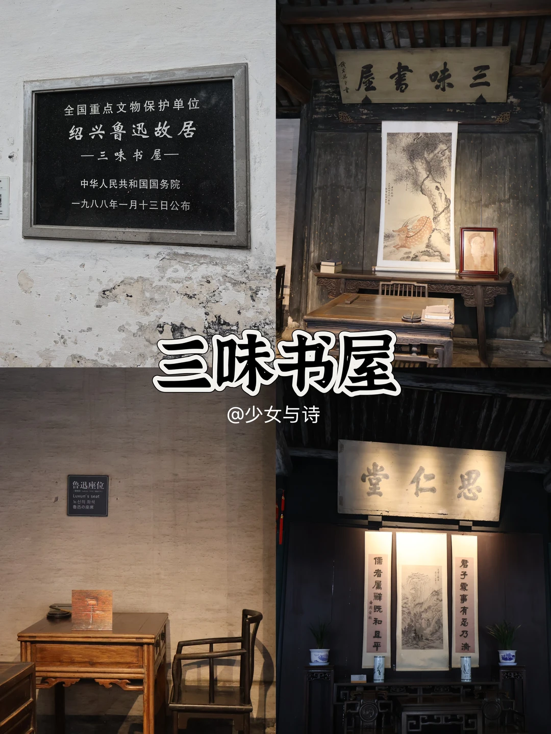 3️⃣三味书屋:清末著名私塾,鲁迅12 - 17岁在此求学。书屋坐东朝西,约35平方米 ,里面有寿镜吾先生的座位,鲁迅的书桌在东北角,右上角刻有“早”字。中间悬挂“三味书屋”匾额,是梁同书所题,匾下“松鹿图”寓意深刻。