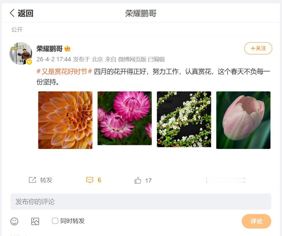 如果说荣耀现阶段的影像天花板是哪款手机,小伙伴们肯定会选择:荣耀Magic8 RSR保时捷设计,刚刚看到荣耀中国区电商部部长鹏哥,分线搞了一组利用这款机型,拍摄春季花卉的照片,2亿像素潜望长焦,搭配时捷设计的影像专属调校,大家觉得质感如何?畅聊数码新品 数码资讯
