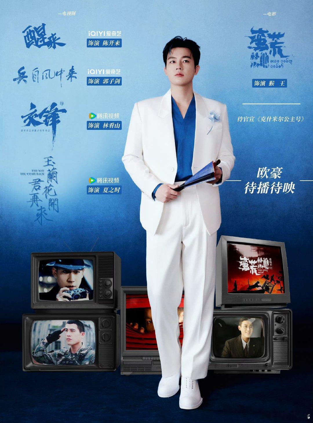 演员欧豪待映作品:影《蛮荒禁地》曹保平导演 饰猴王影《克什米尔公主号》刘伟强导演剧《玉兰花开君再来》 饰夏之时 剧《交锋》姚晓峰导演 饰林看山剧《醒来》赵宝刚导演 饰 陈开来剧《兵自风中来》 饰郭子剑