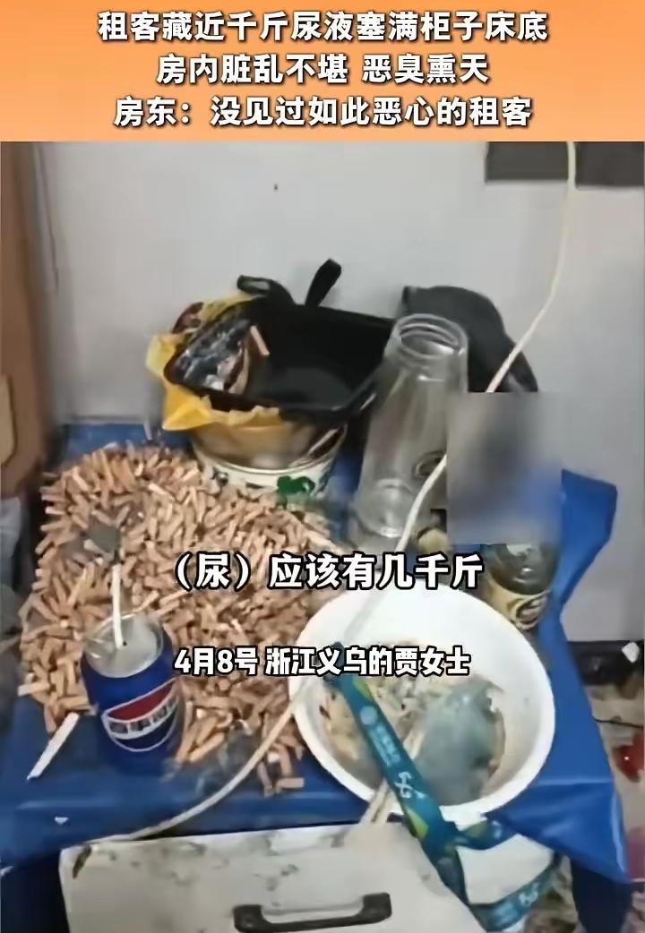 4月6日,浙江义乌。房东算是见识了前所未有的邋遢鬼租客。 租客是名40岁的男子,屡屡拖欠房租,打电话也联系不上。租房一年,就拖欠了5000元房租,房东打算更换密码锁。 打开房门,首先就被一股恶臭熏到了。再看看房间,让人不忍直视。垃圾扔得到处都是,成千上万的烟头扔满一地。墙上、空调机被烟熏的焦黄。更不可思议的是,上千个瓶孑里装满了尿液。床底下、柜子里面塞满了这样的瓶子。房东不得其解,马桶好好的不用,非得存放在瓶子里。 男子真的是又懒又邋遢,在恶臭熏天,烟雾缭绕污浊不堪的恶劣环境下,竟然还能坚持生活,恐怕流浪汉也做不到。真的是懒到了极致。 房主可不惯着他,打算通过法律途径追回租金和500元清洁费。 人啊,最怕的就是懒。人一懒,什么事情都不想去做,日子过得浑浑噩噩的。比如这个男子,都不愿走几步上个厕所,一年来的烟头都丢在房间里。这样的人只是在混日子,很难有所作为。40岁的人,正当壮年,有丰富的经验,应当振作起来,大展身手。可不能消沉,这样会毁了自己。 租客藏近千斤尿液塞满柜子床底出租房邋遢鬼