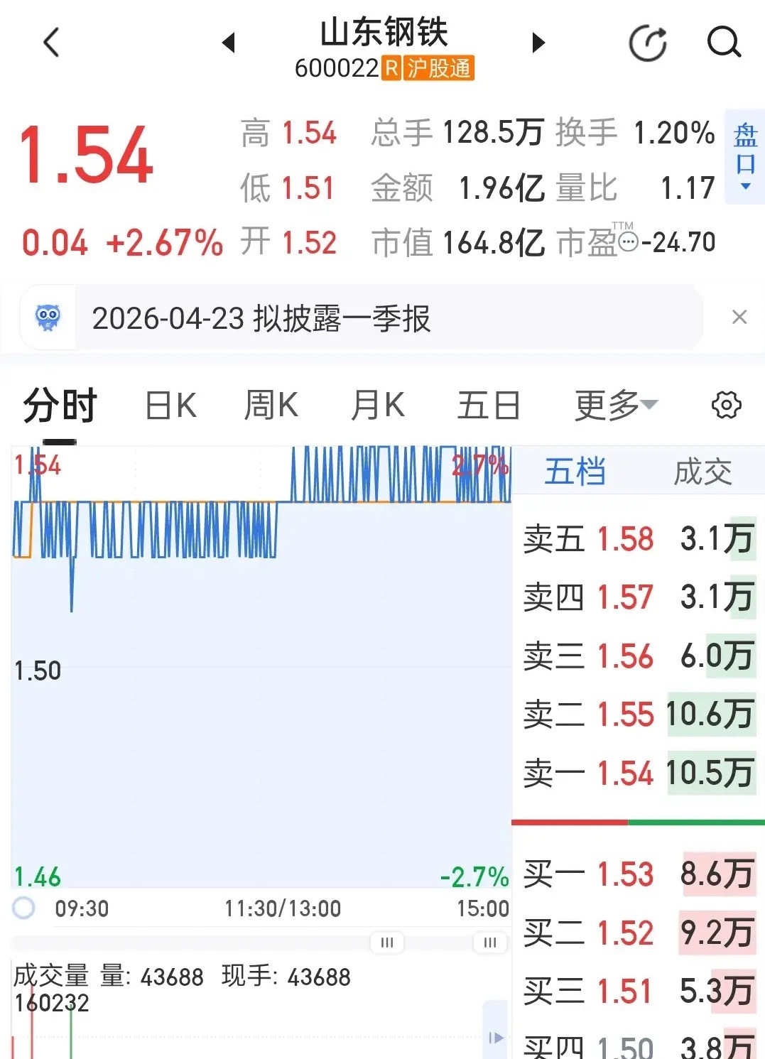 山东钢铁现在就是个低位磨底、小幅反弹的状态,今天收在1.54元,涨了2.67%,成交量和换手率都一般,属于超跌后的弱反弹,不是强势主升。明天大概率是小幅震荡、冲高回落。明天小涨小跌、震荡为主,可能小幅冲高(摸到1.55–1.56)但很难站稳,尾盘容易回落,收个小阳、小阴或十字星。预测明天最高价1.56,次高价1.55,次低价1.52,最低价1.50。