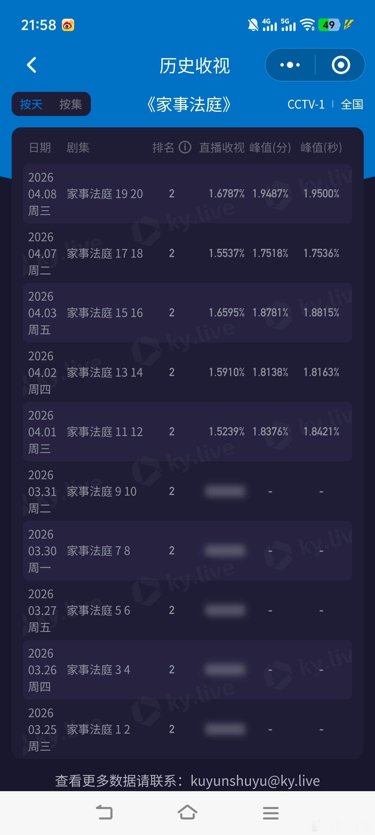 家事法庭 今晚收视大涨,酷云峰值1.95,平均1.6787!最近两周新高,今晚cvb破3也没悬念!!